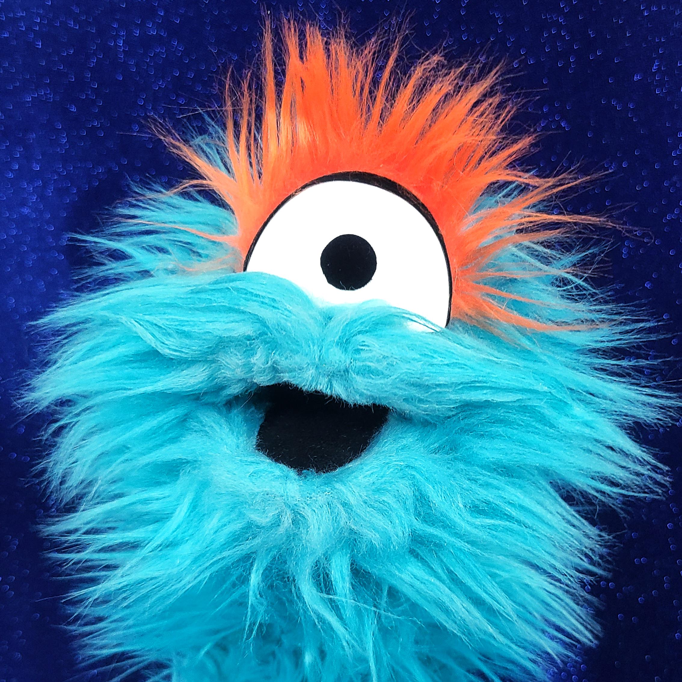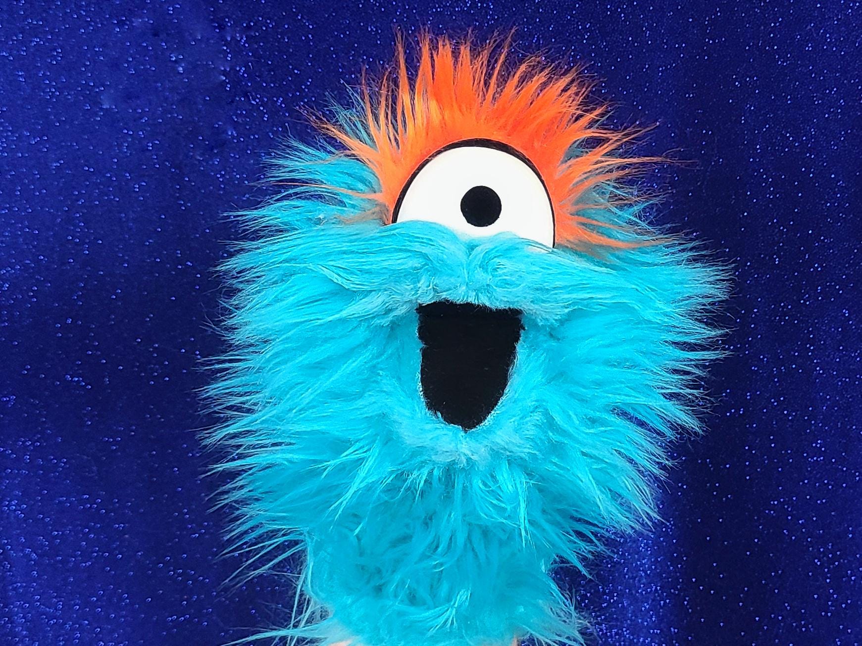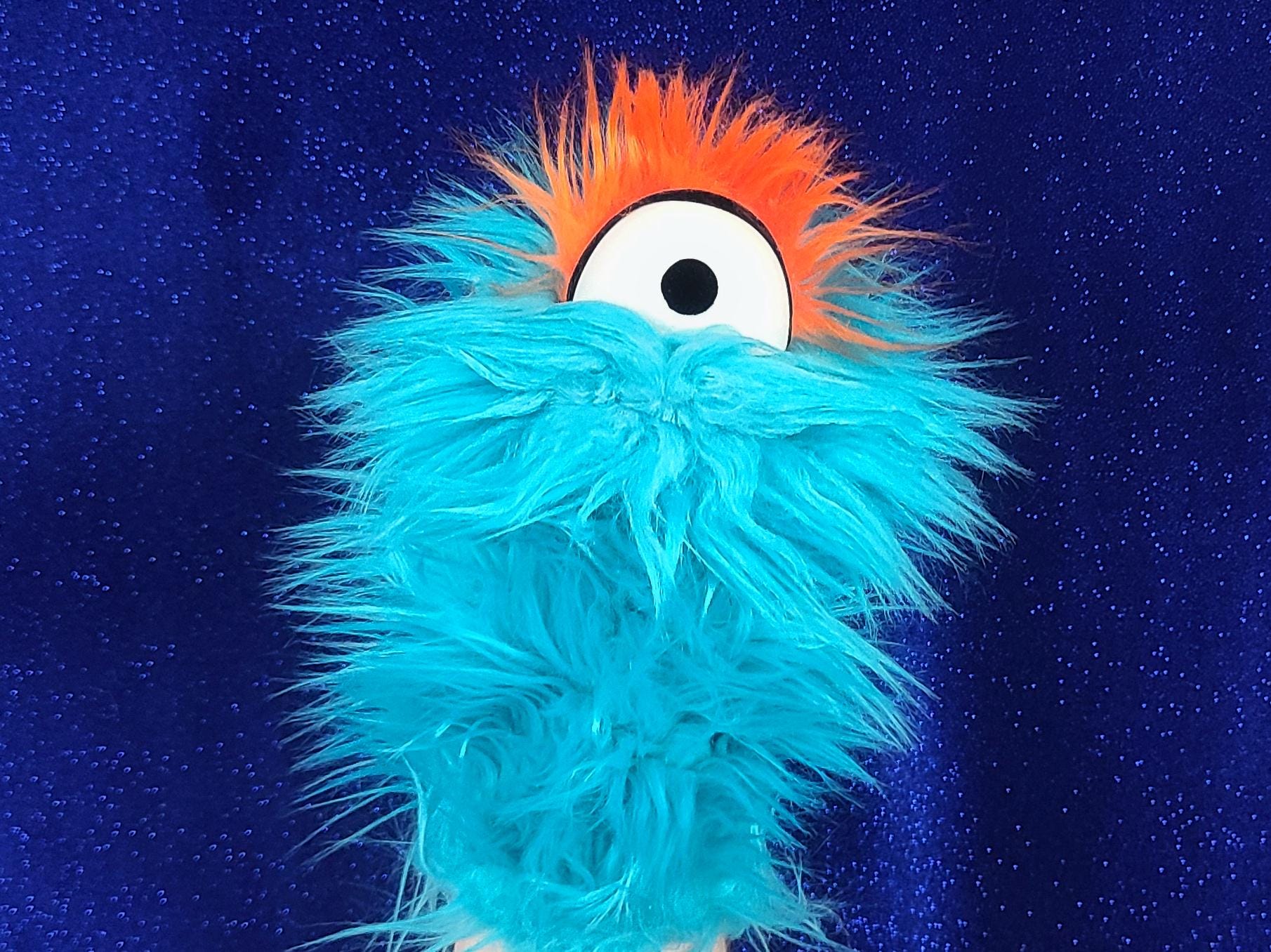 This is a practice puppet of a aqua blue monster with one 3D printed eye and an orange eyebrow. Perfect for puppetry practice! It is of professional quality, using quality fabrics. Made of faux fur. See the attached photos for more!
