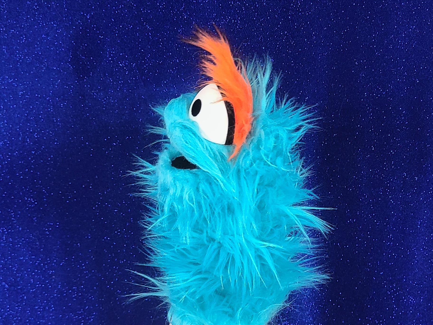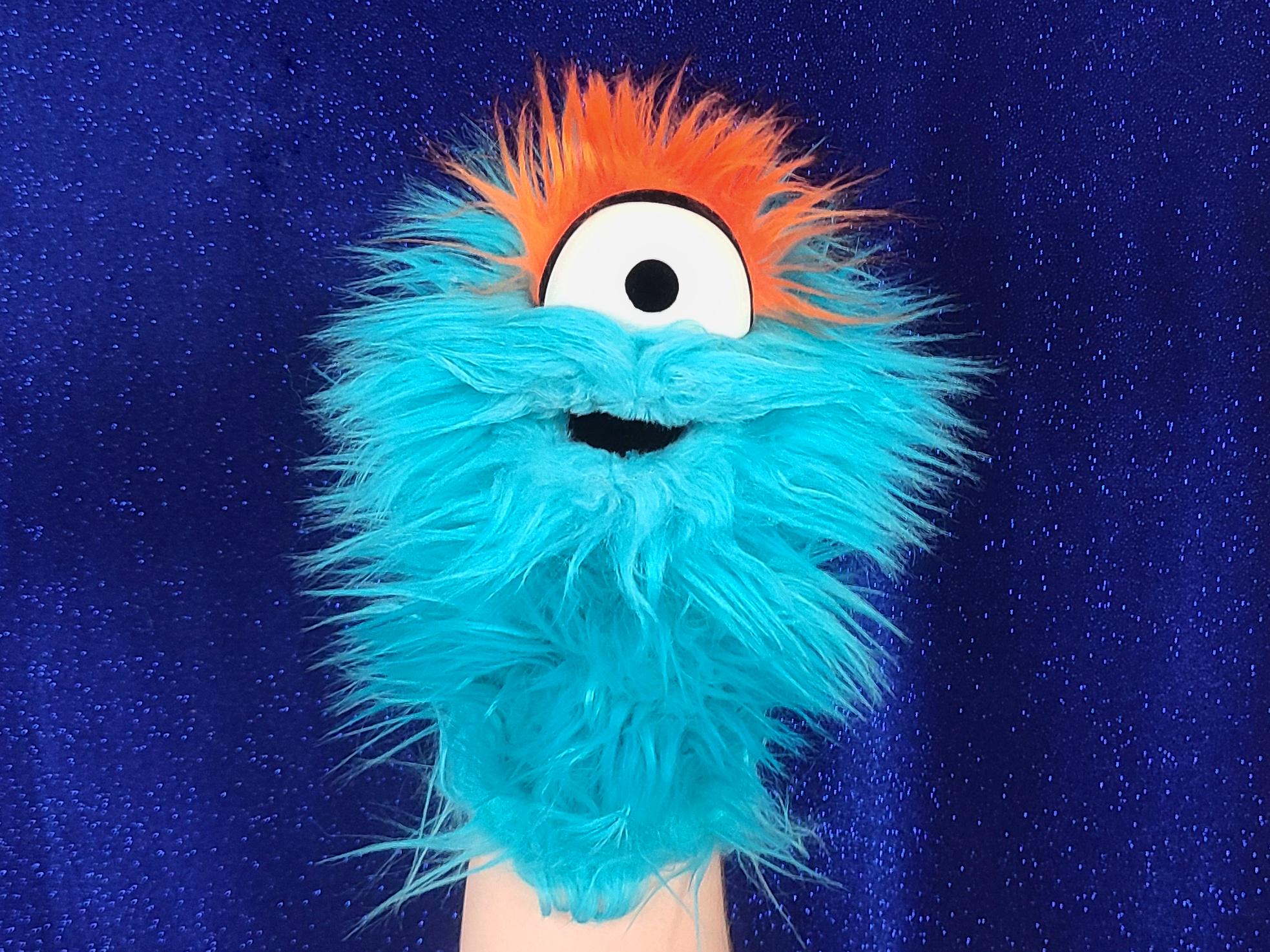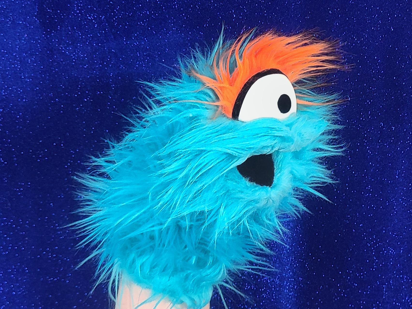 This is a practice puppet of a aqua blue monster with one 3D printed eye and an orange eyebrow. Perfect for puppetry practice! It is of professional quality, using quality fabrics. Made of faux fur. See the attached photos for more!
