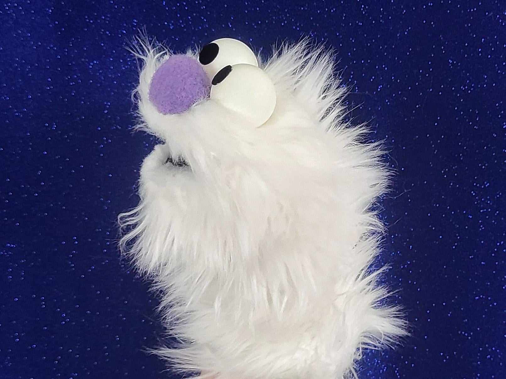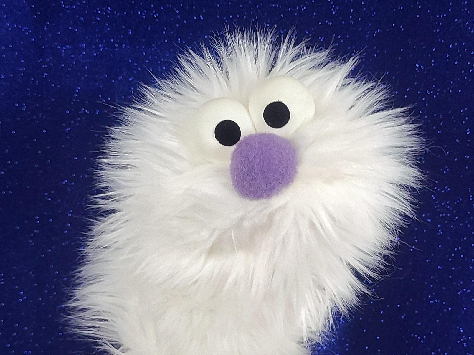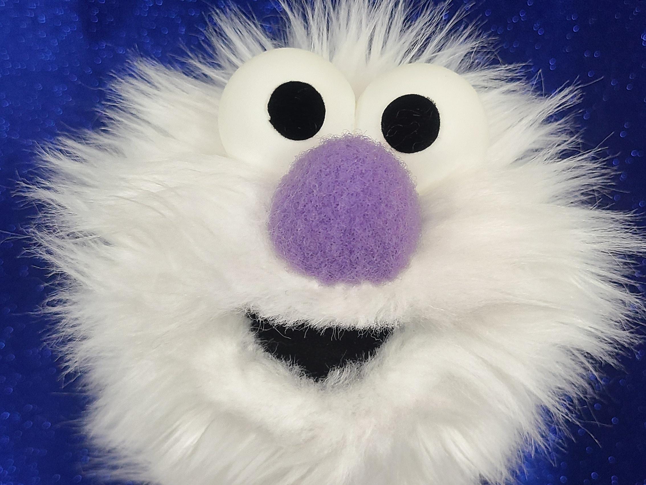 This is a practice puppet of a white monster with purple nose. Perfect for puppetry practice! It is of professional quality, using quality fabrics. Made of faux fur. See the attached photos for more!