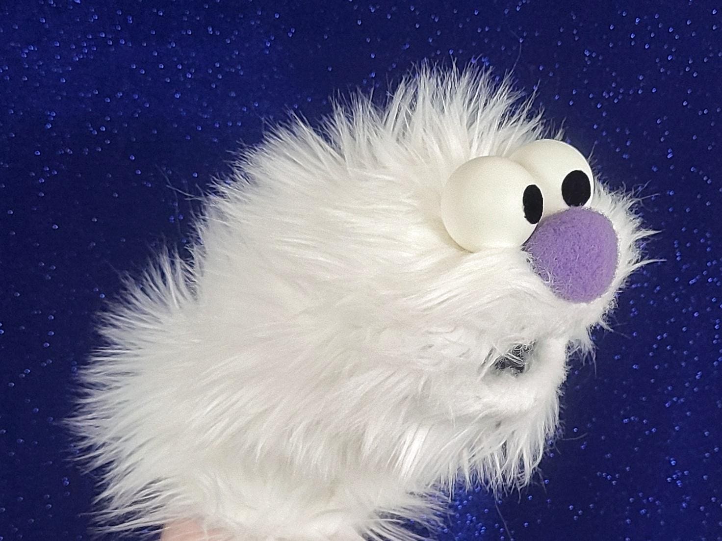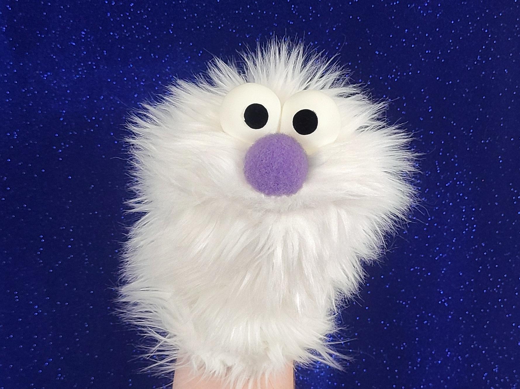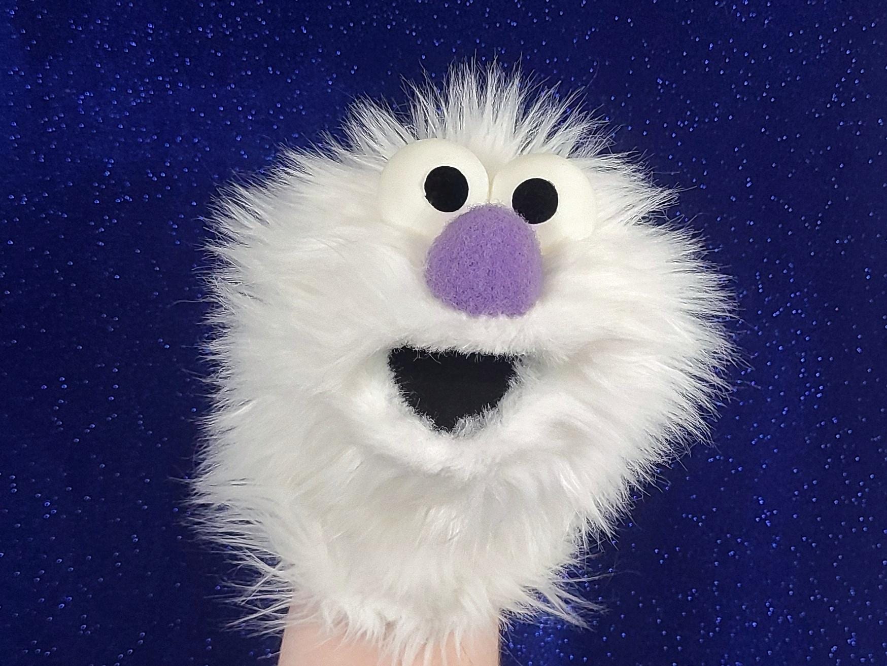 This is a practice puppet of a white monster with purple nose. Perfect for puppetry practice! It is of professional quality, using quality fabrics. Made of faux fur. See the attached photos for more!