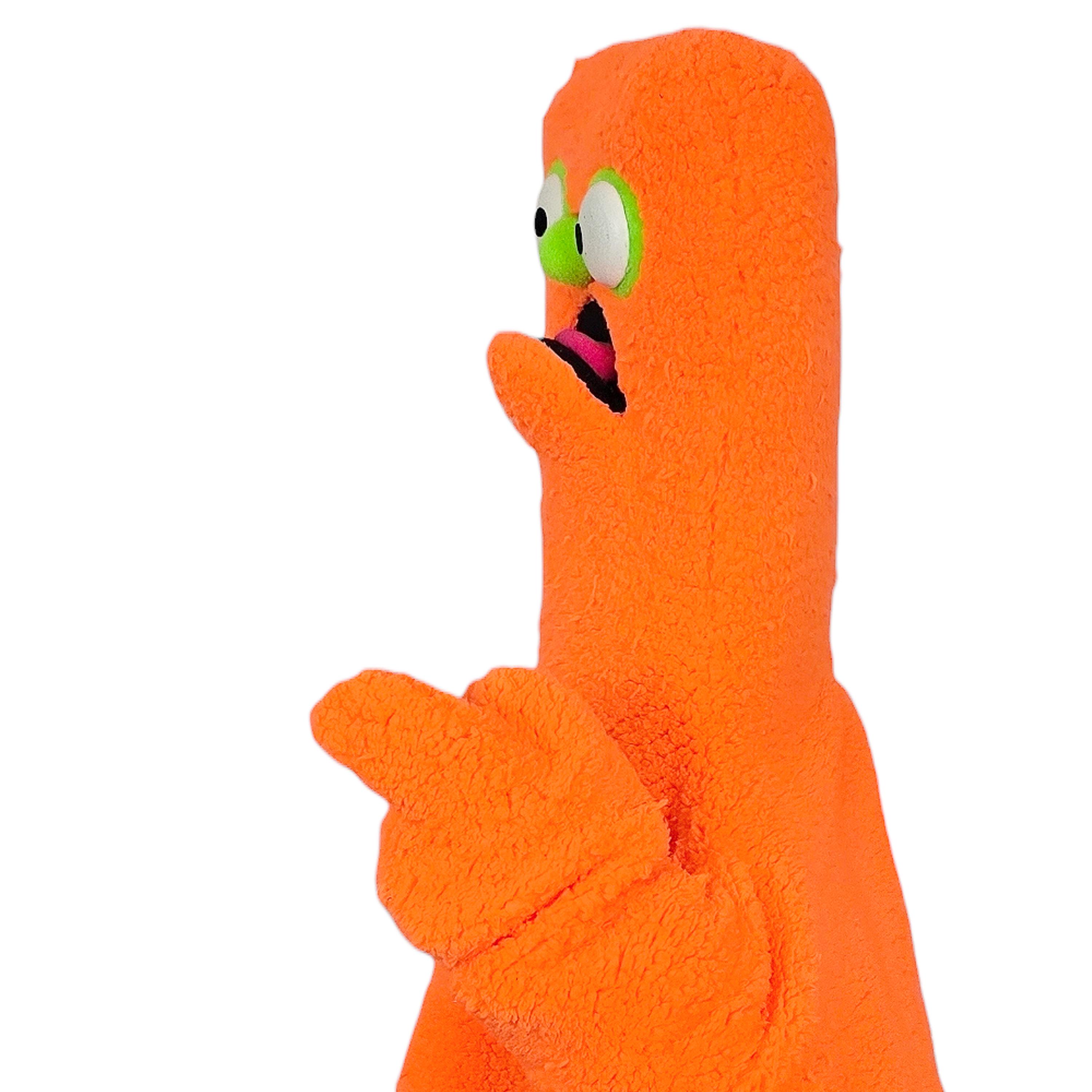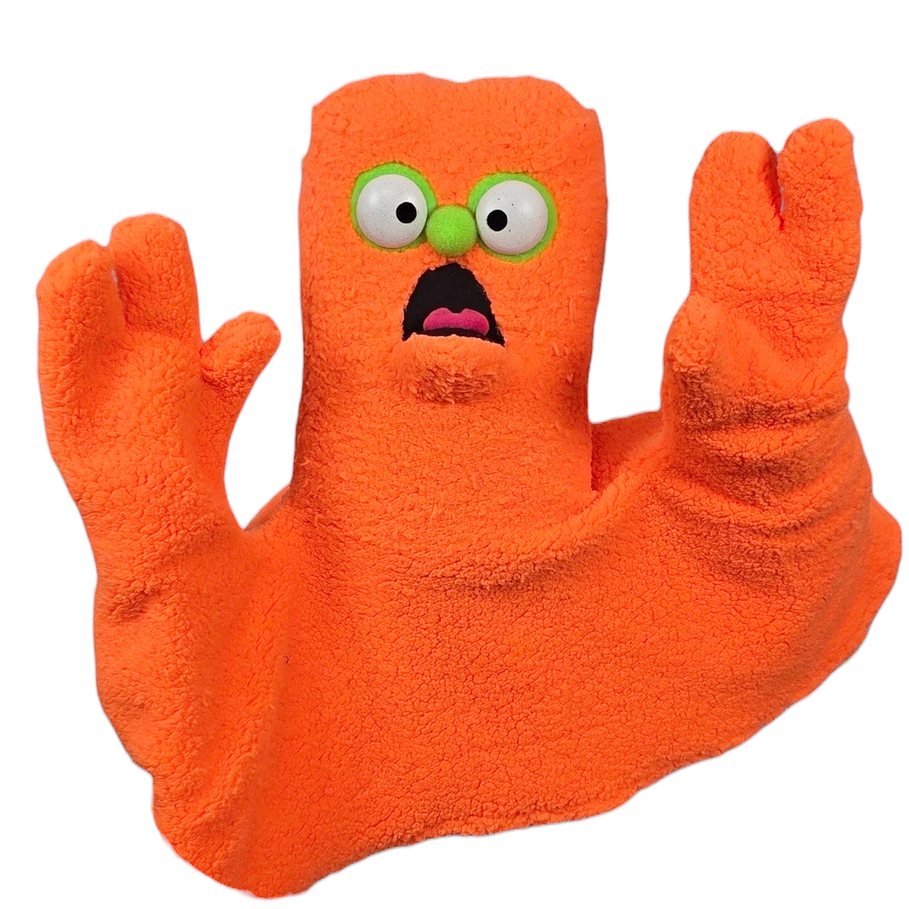 The puppet is neon orange with green features. Includes "oven mitt" style mouth.