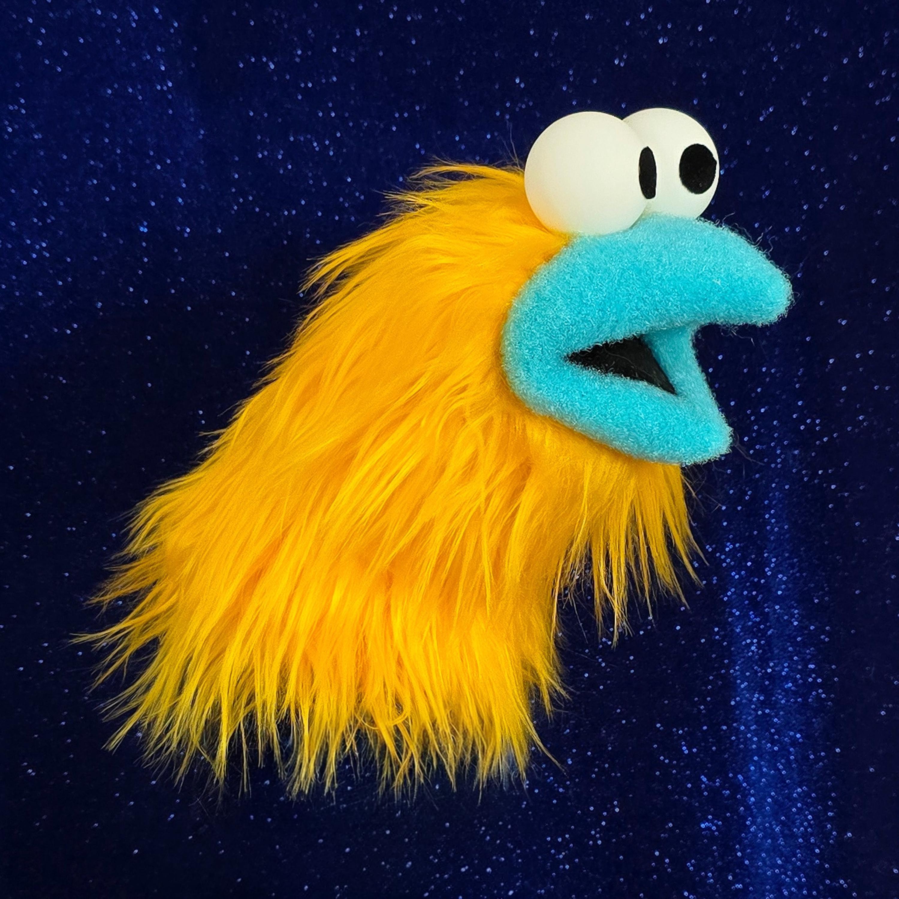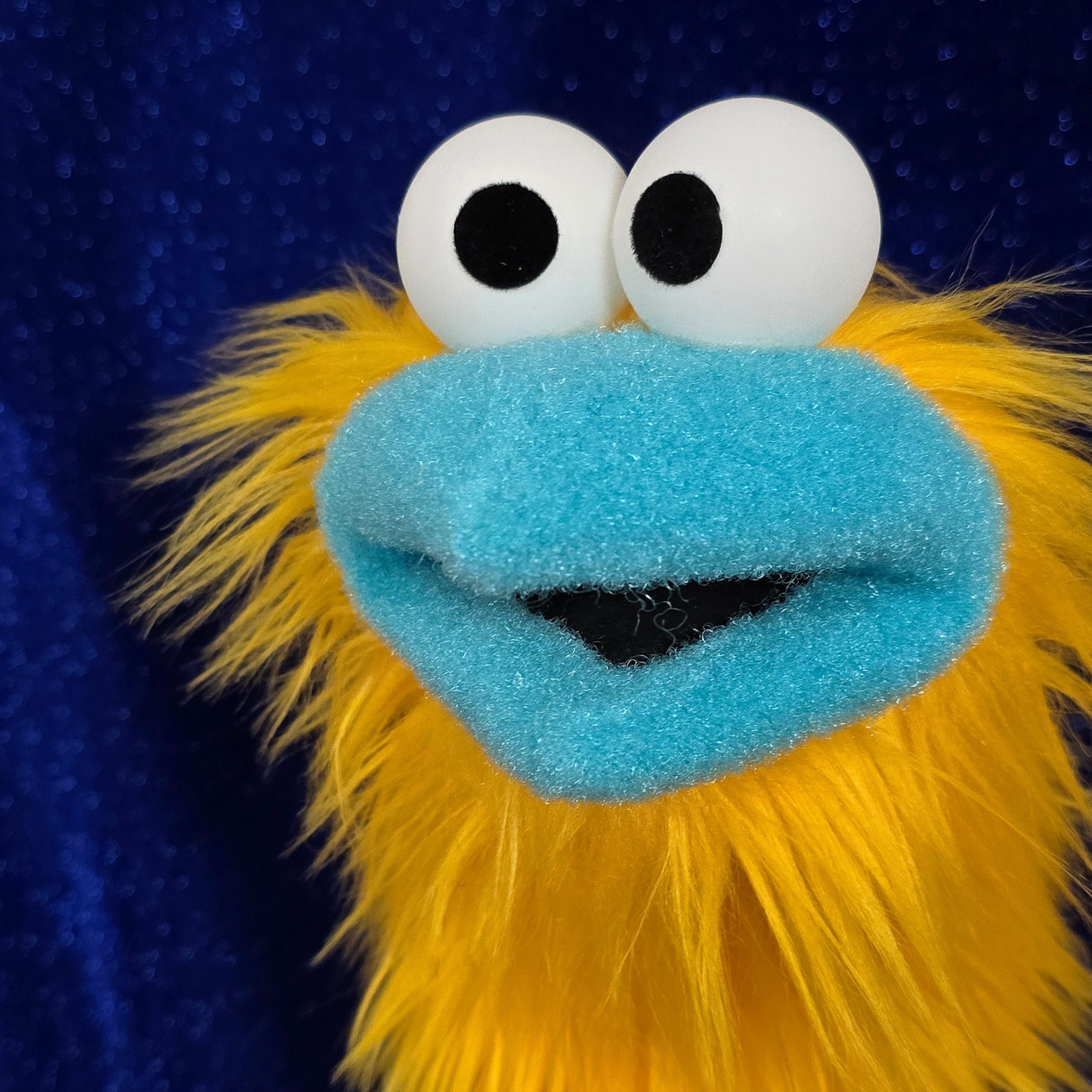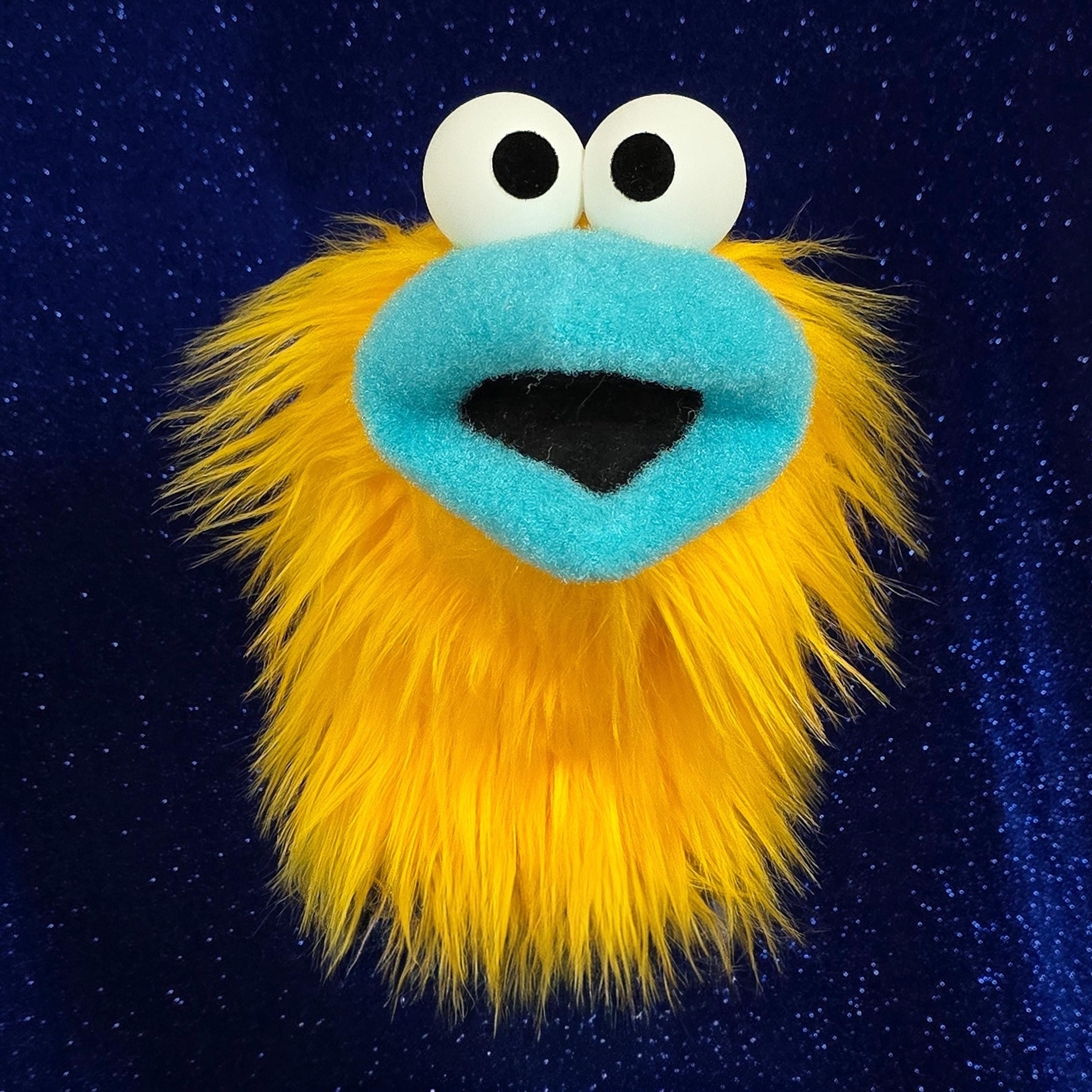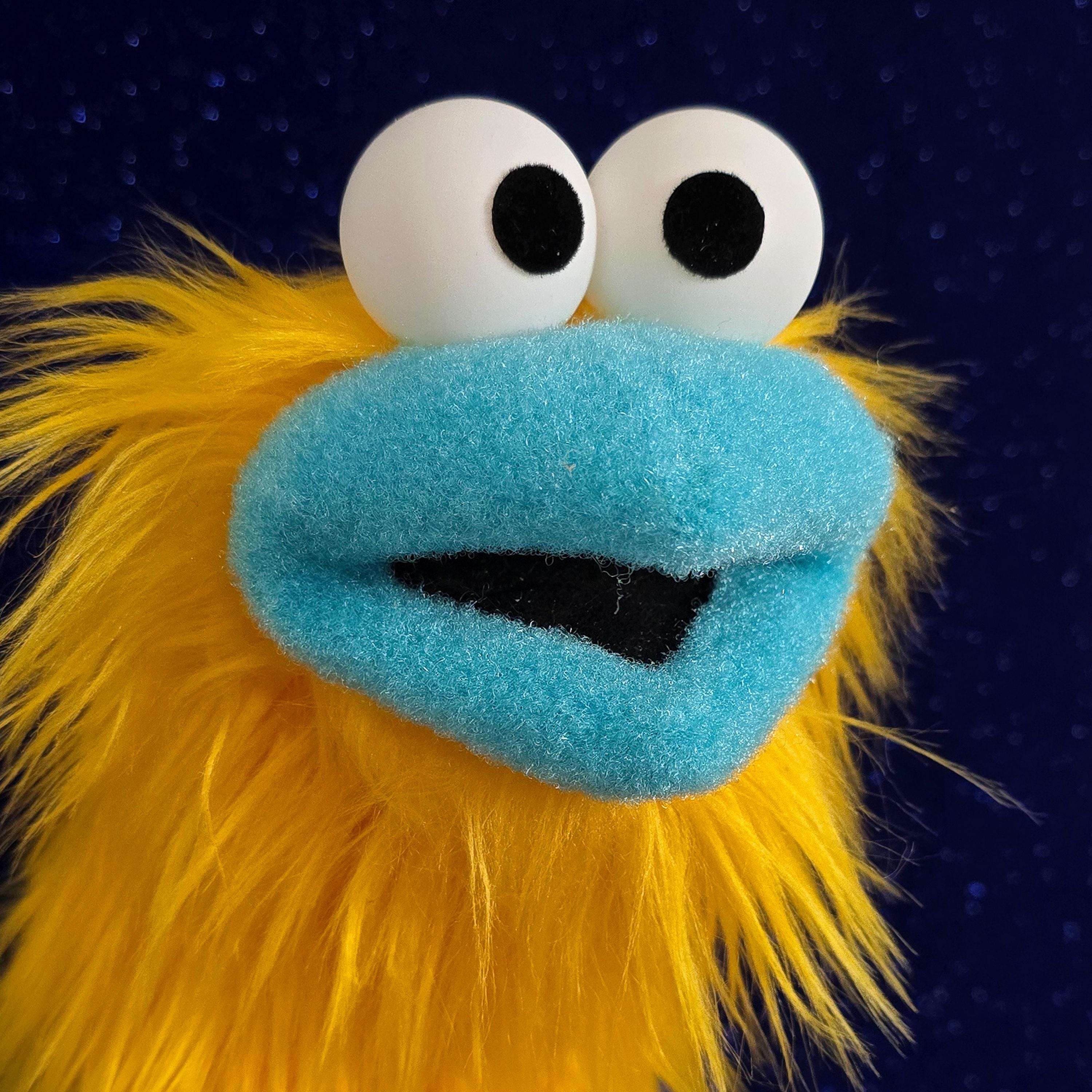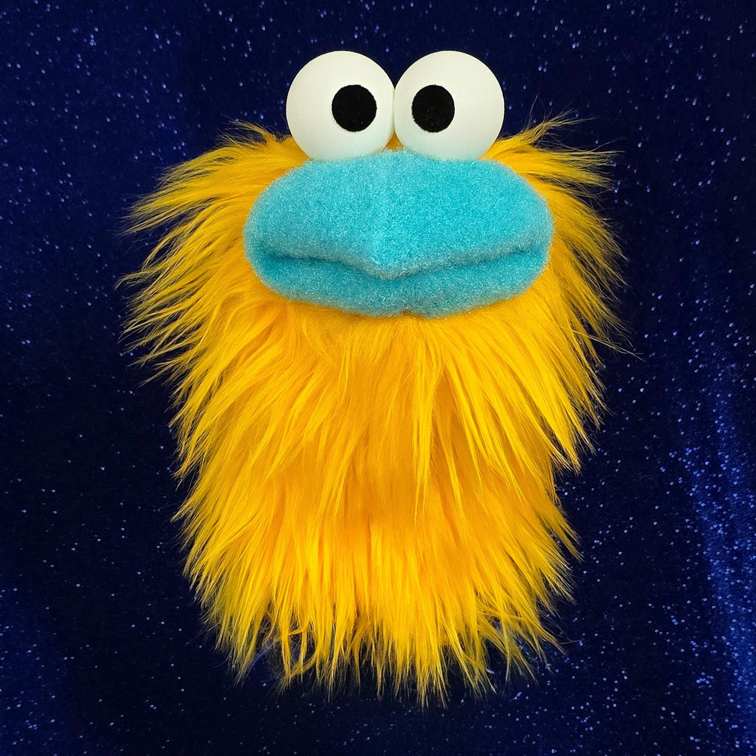 This is a practice puppet of a yellow bird or monster character with a bright blue beak. It is of professional quality, using quality fabrics. Made of faux fur. See the attached photos for more!