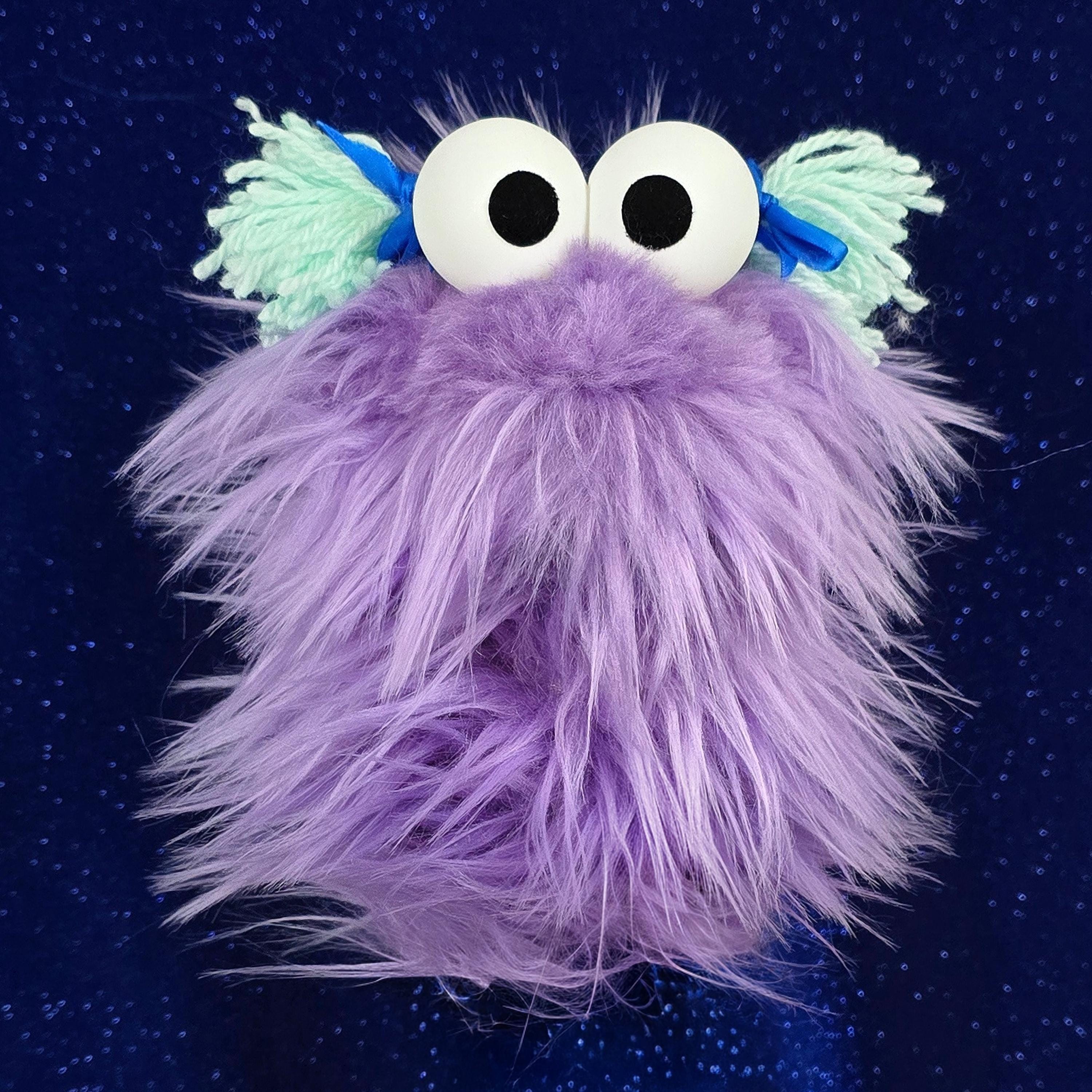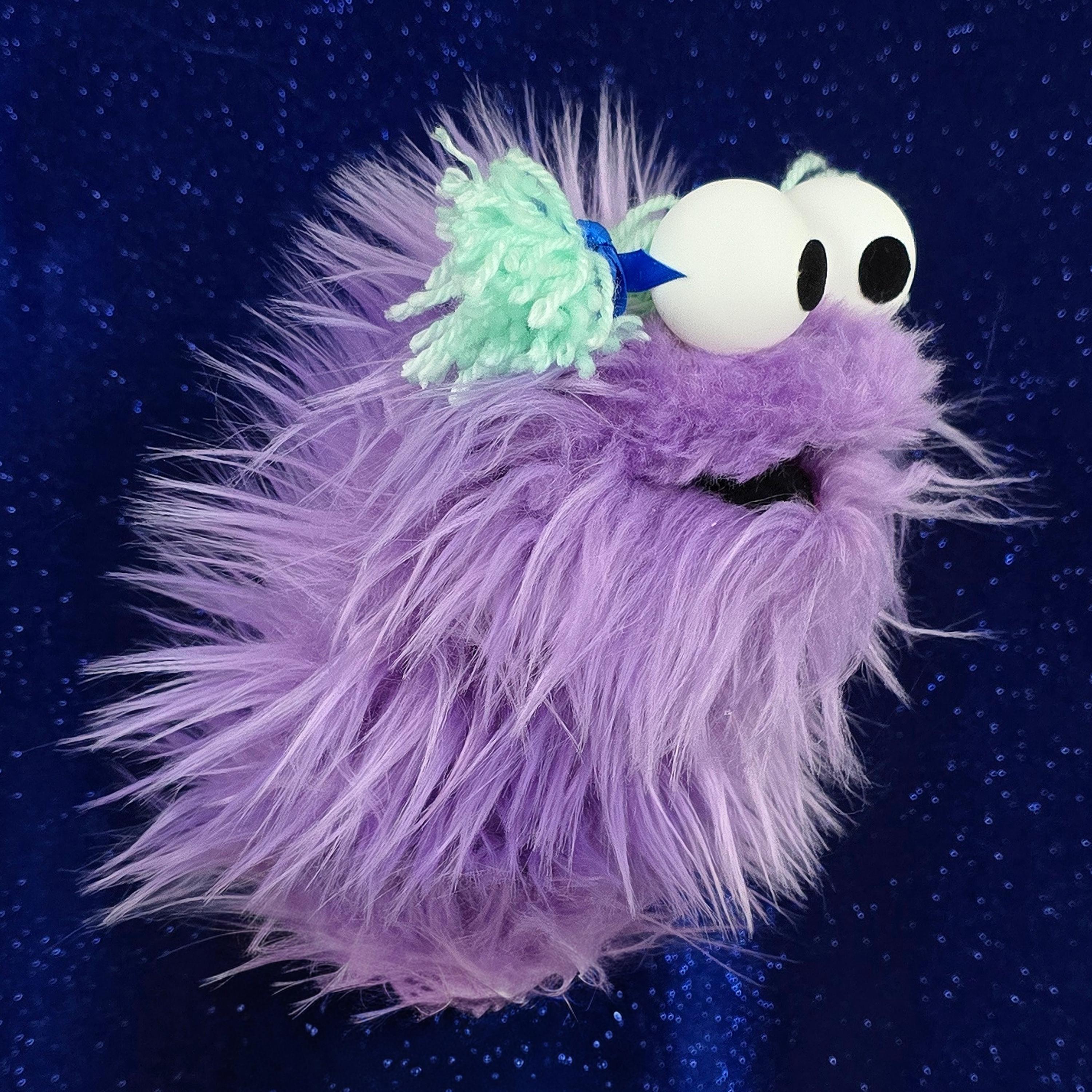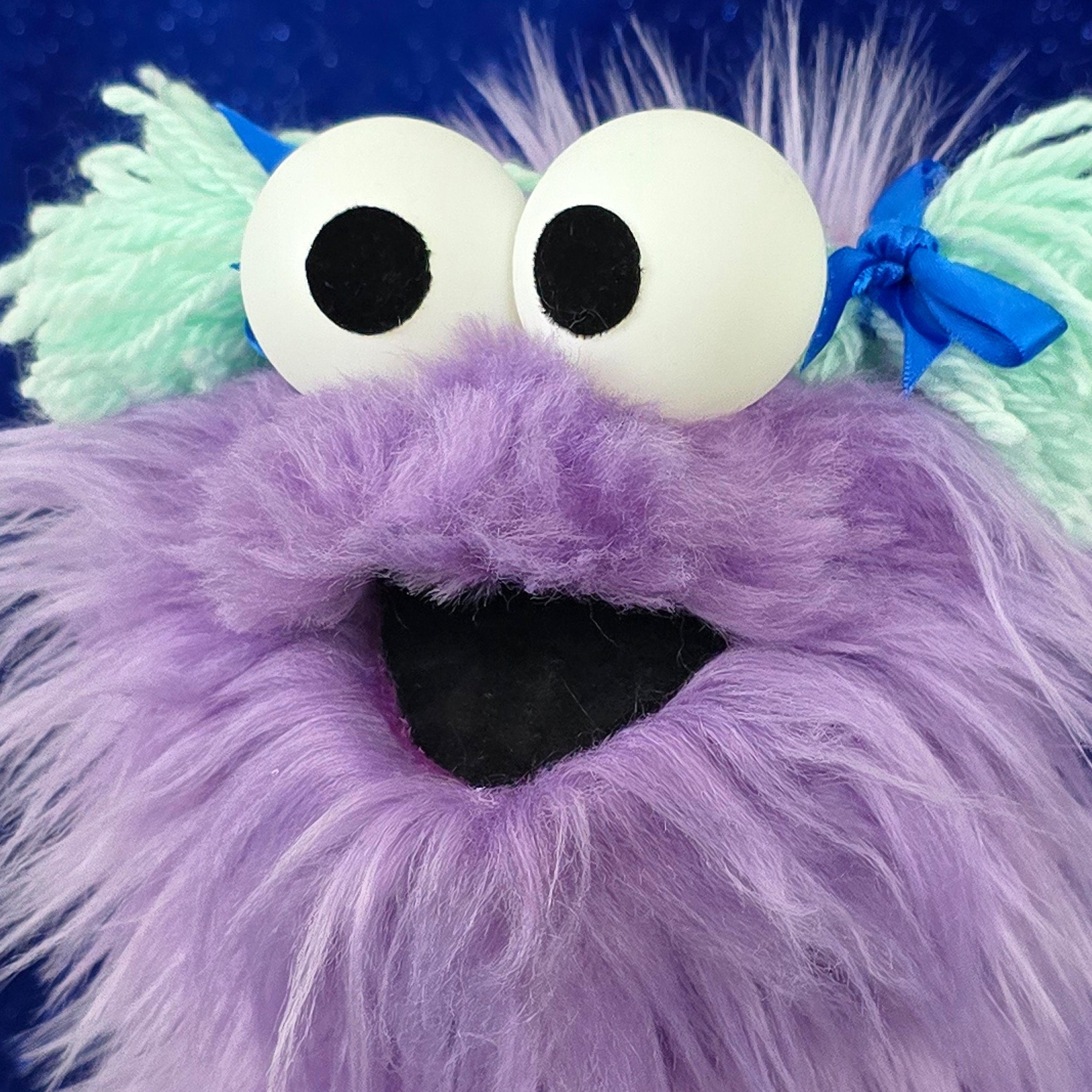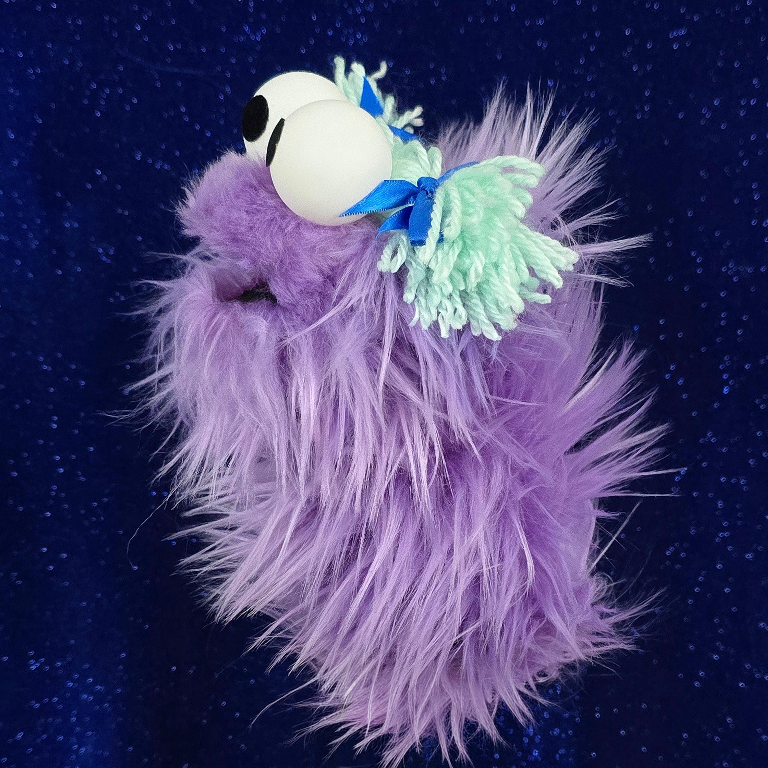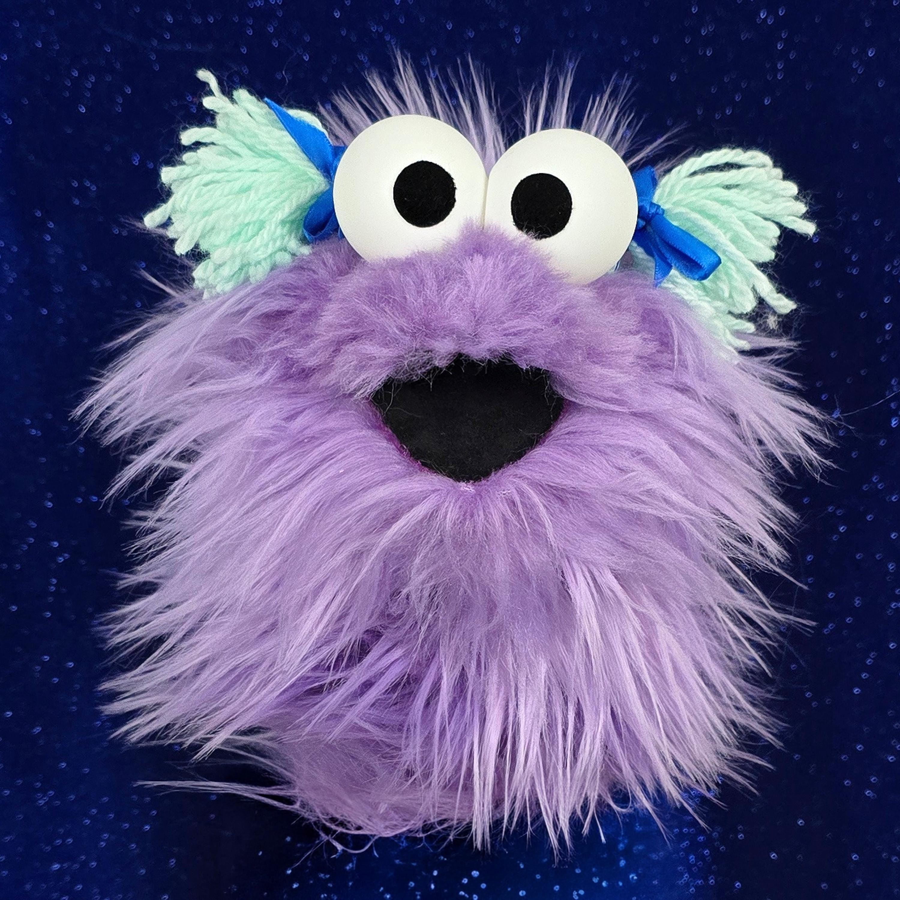 This is a practice puppet of a purple monster with blue yarn hair and bows. Perfect for puppetry practice! It is of professional quality, using quality fabrics. Made of faux fur. See the attached photos for more!