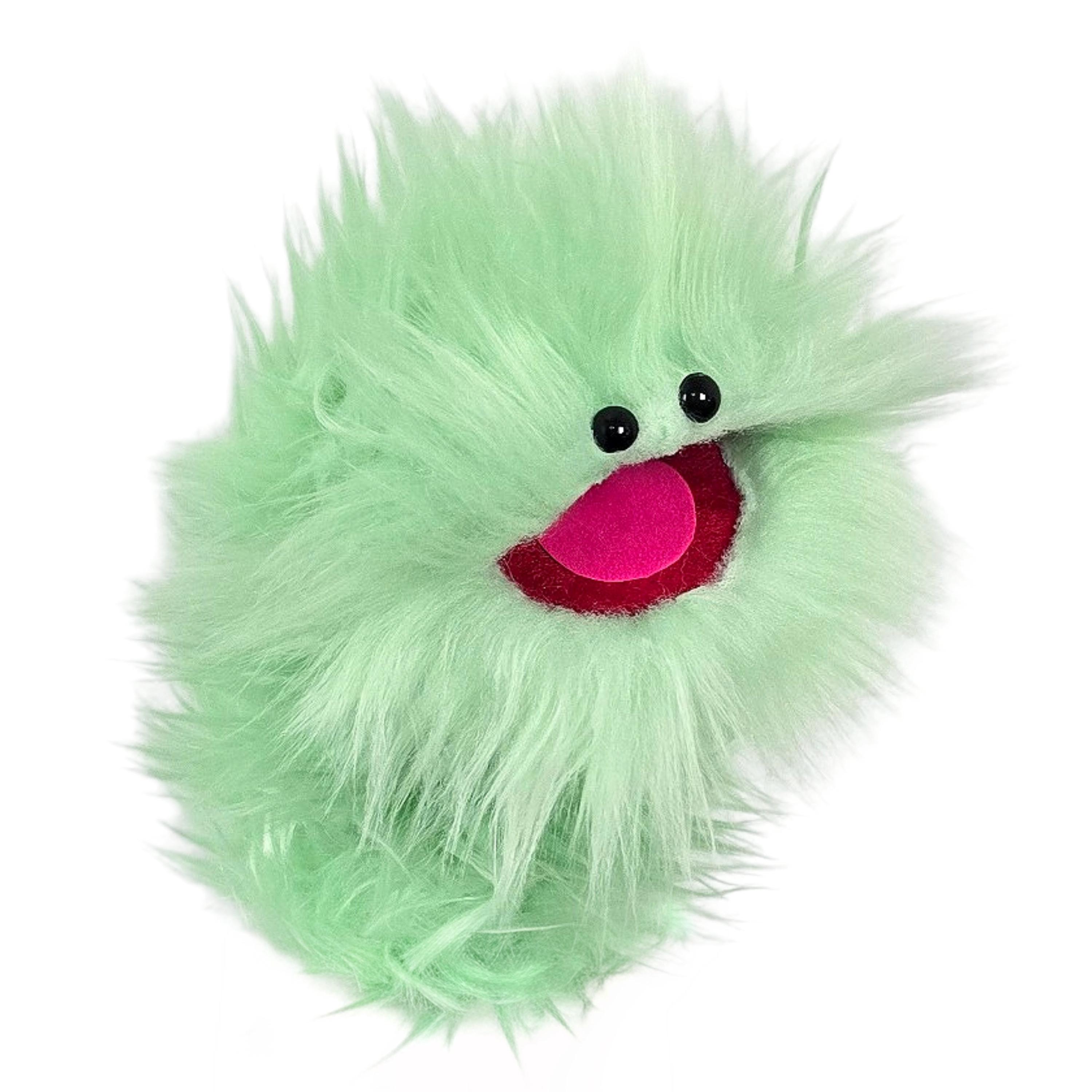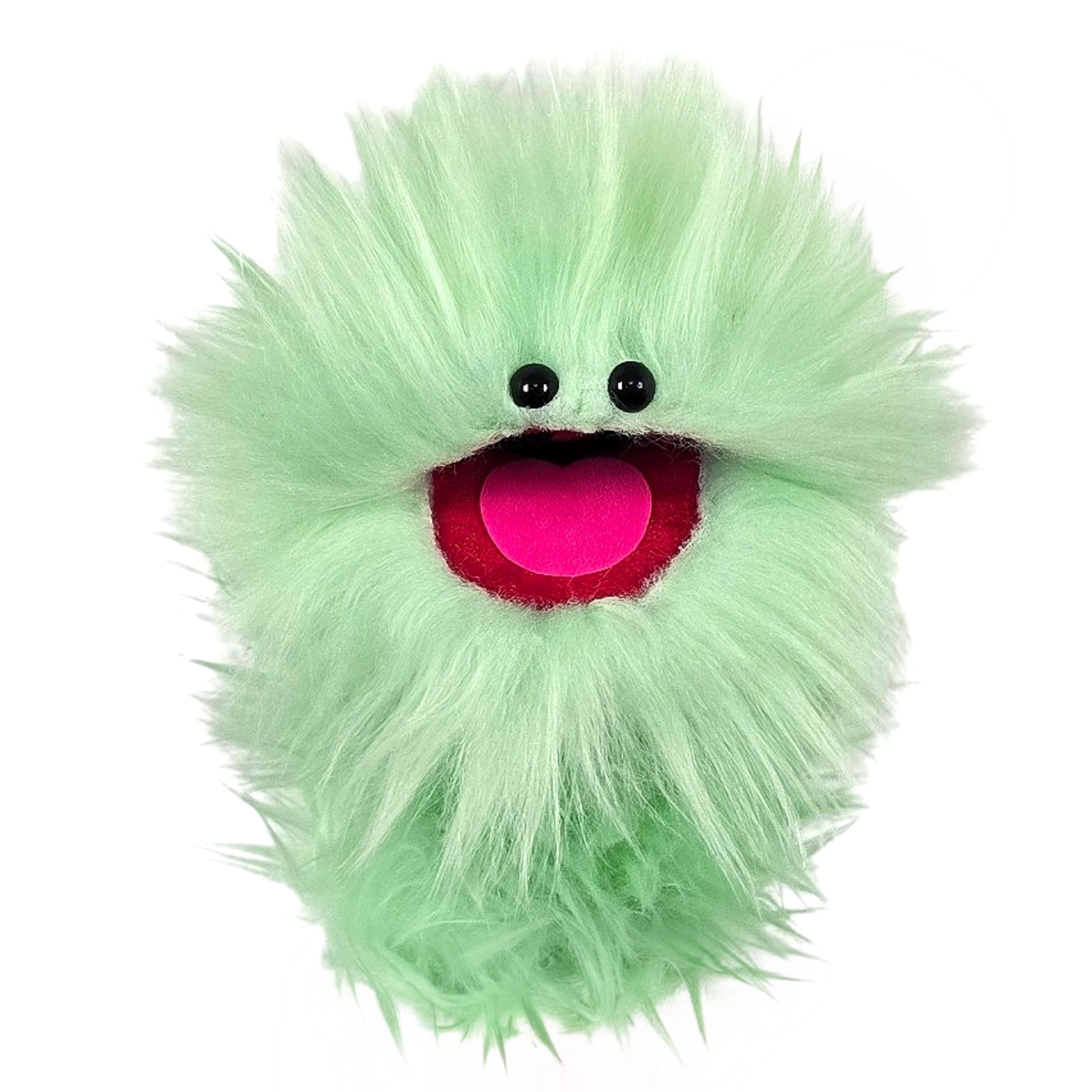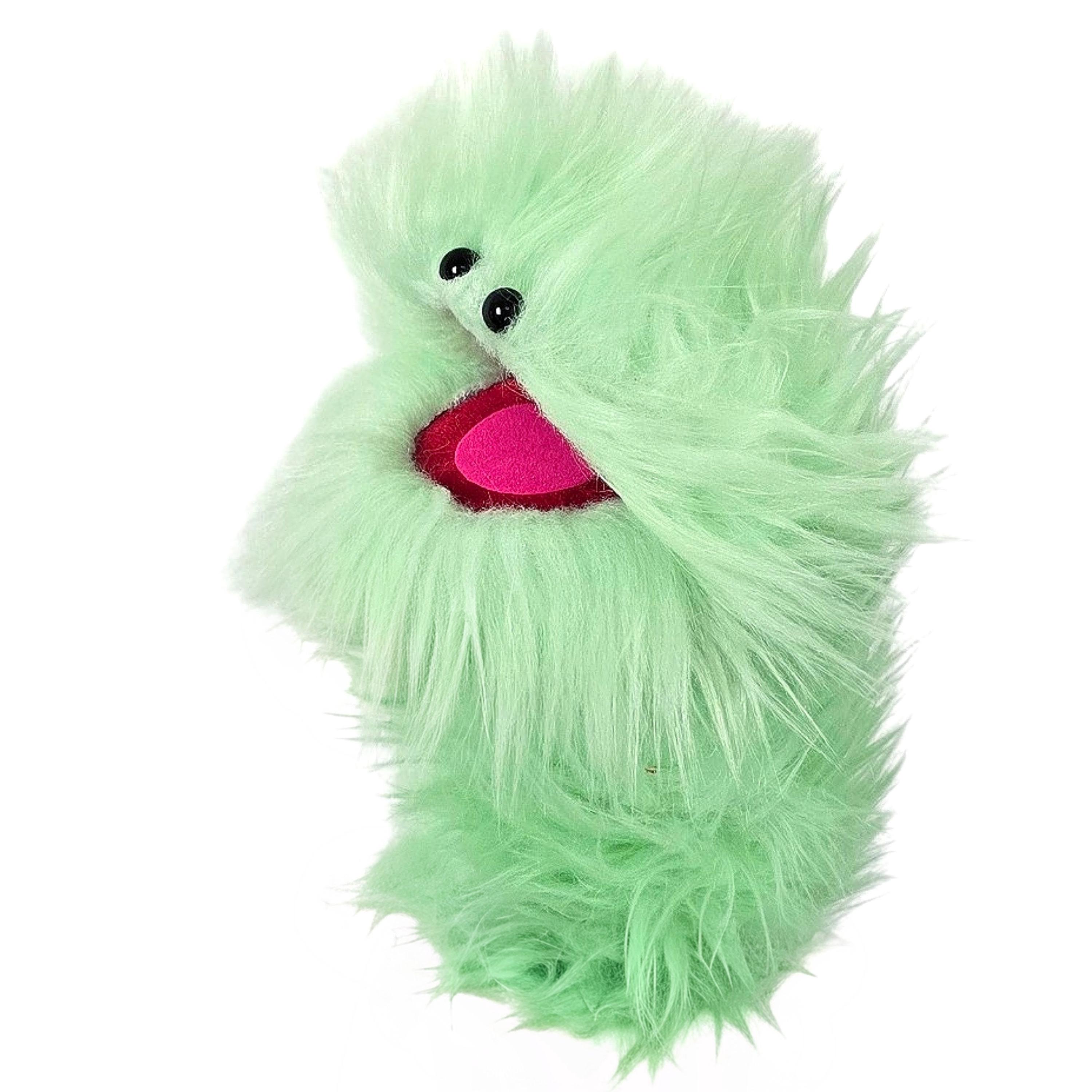 This is a practice puppet of a mint green monster with beady eyes. Perfect for puppetry practice!