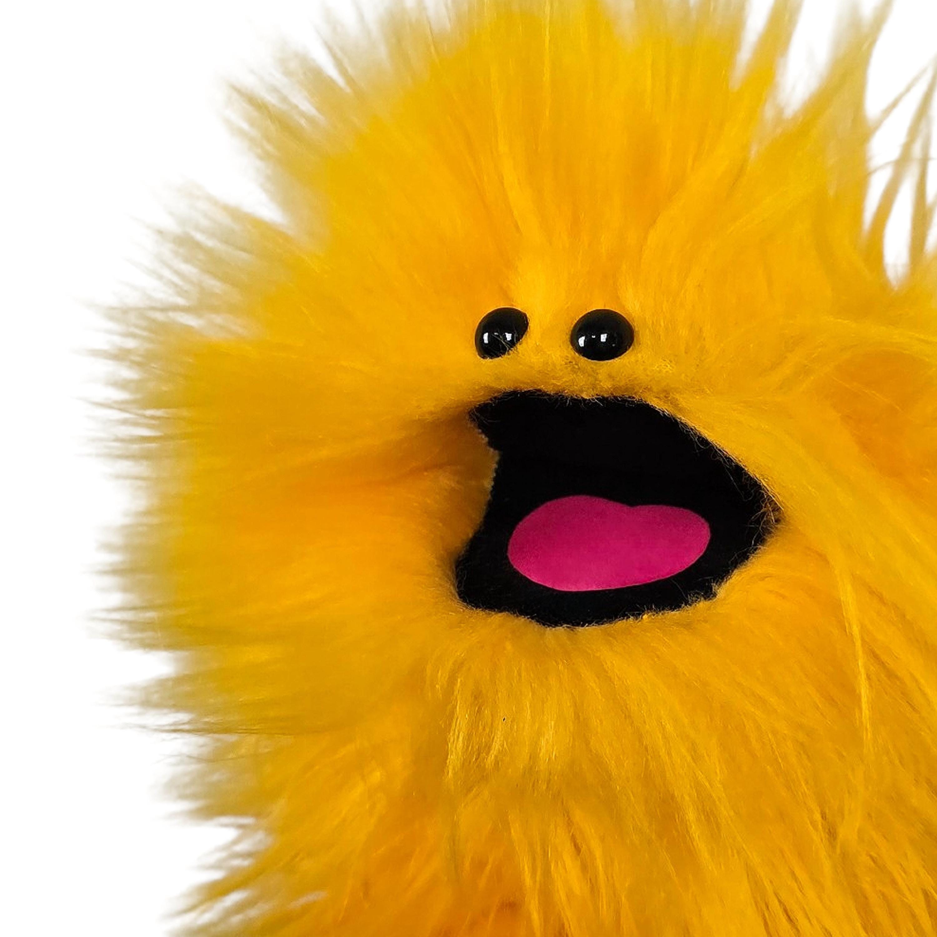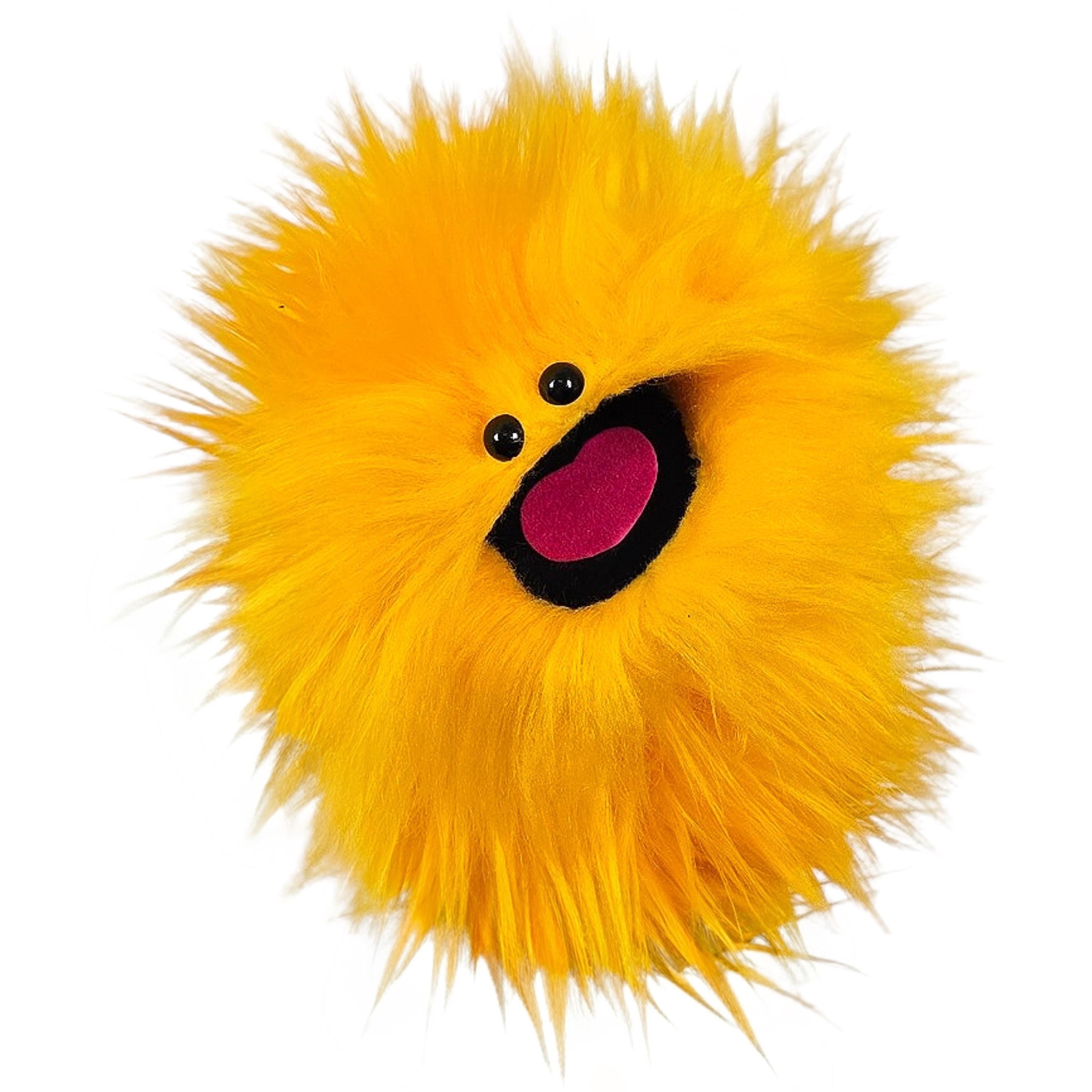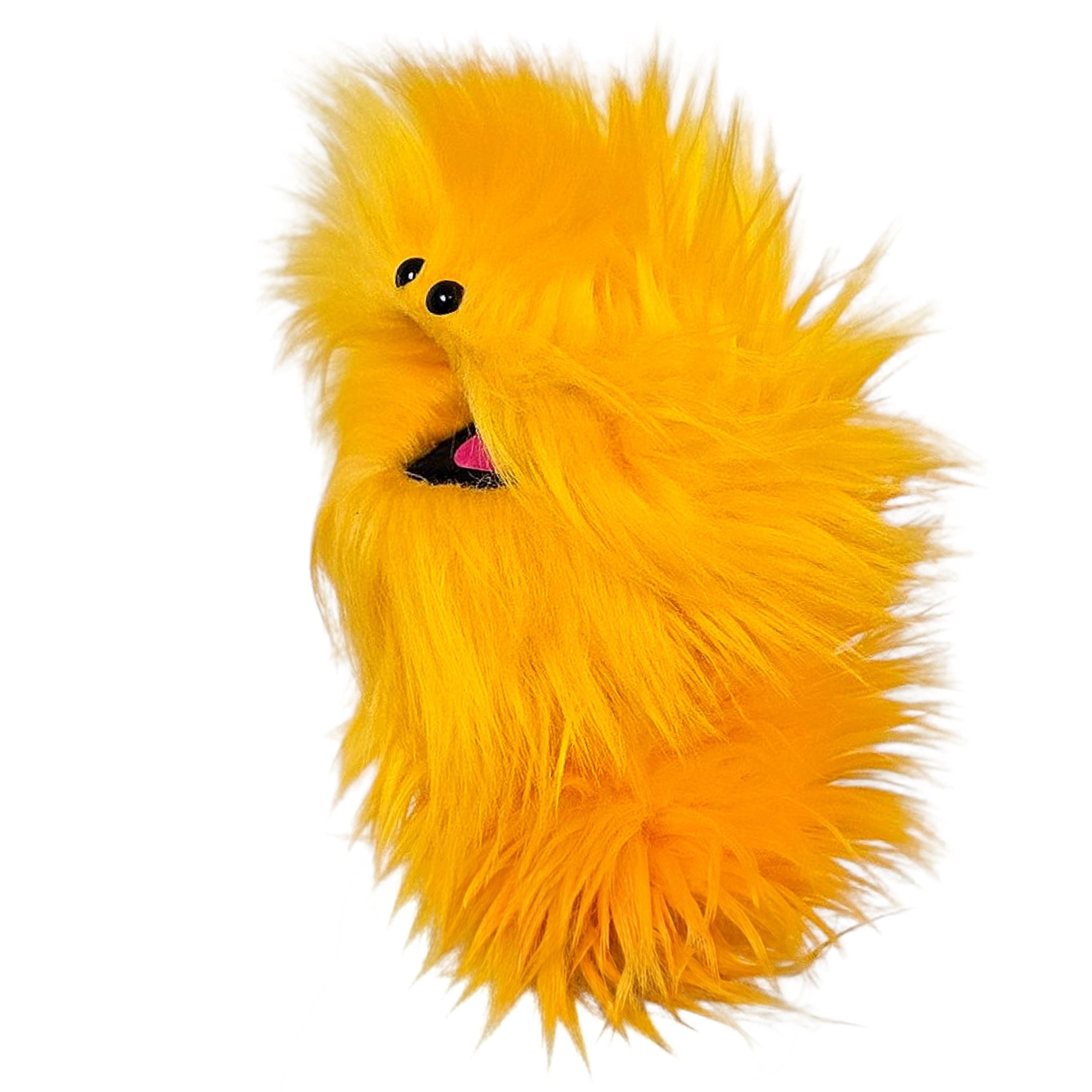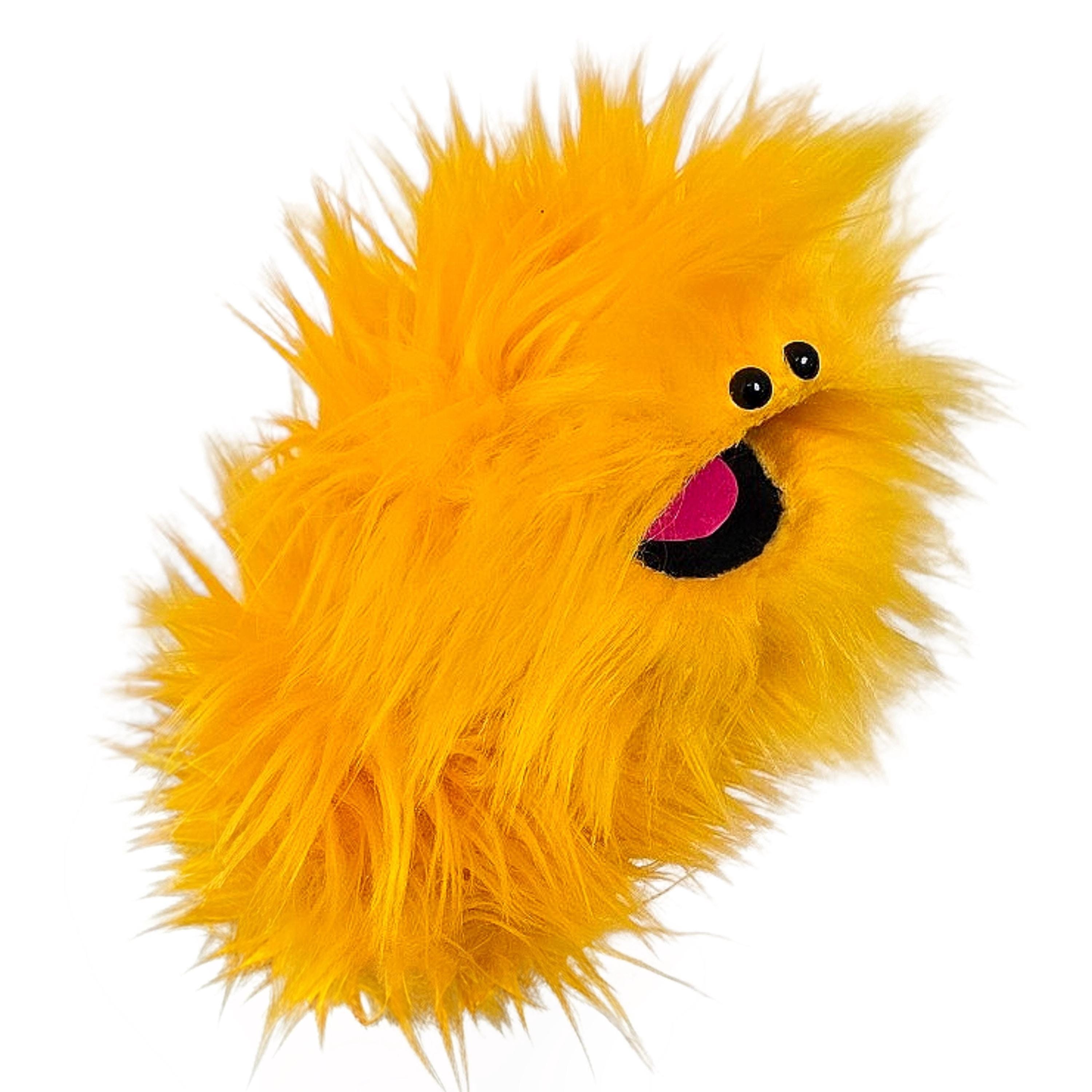 This is a practice puppet of a yellow monster with beady eyes. Perfect for puppetry practice!