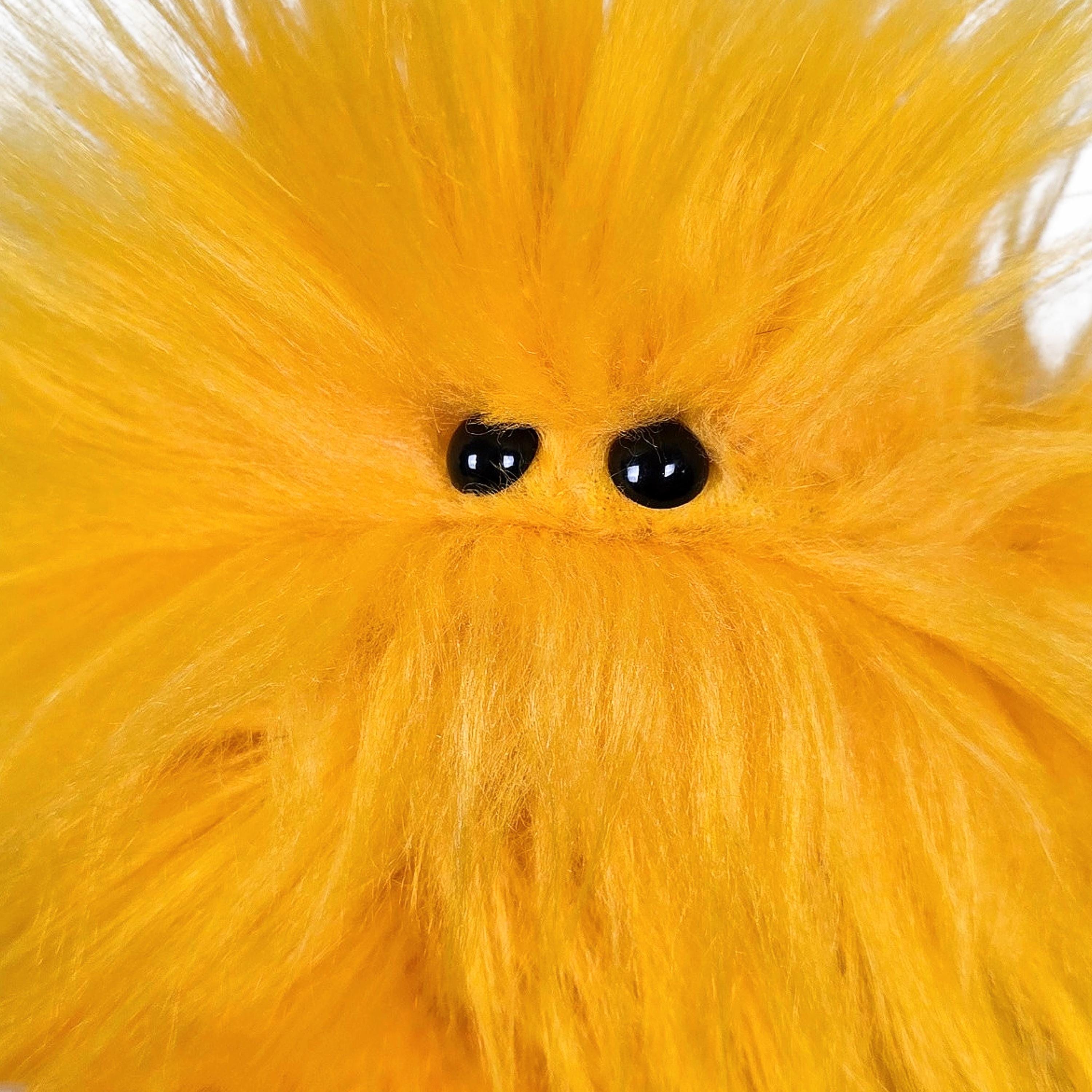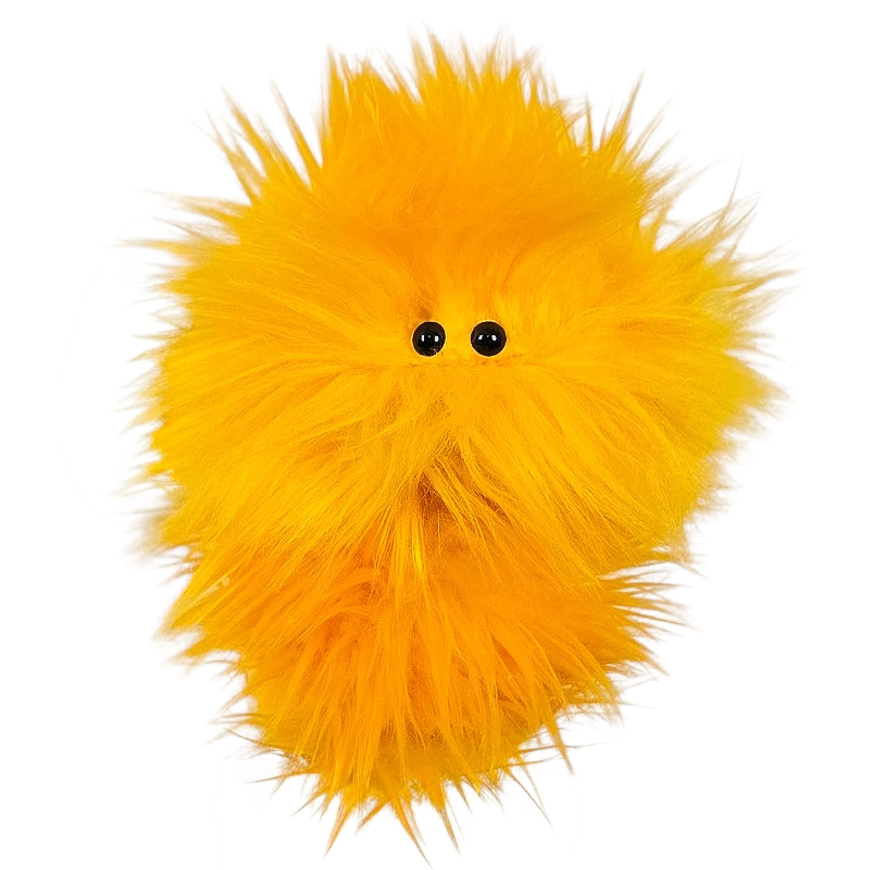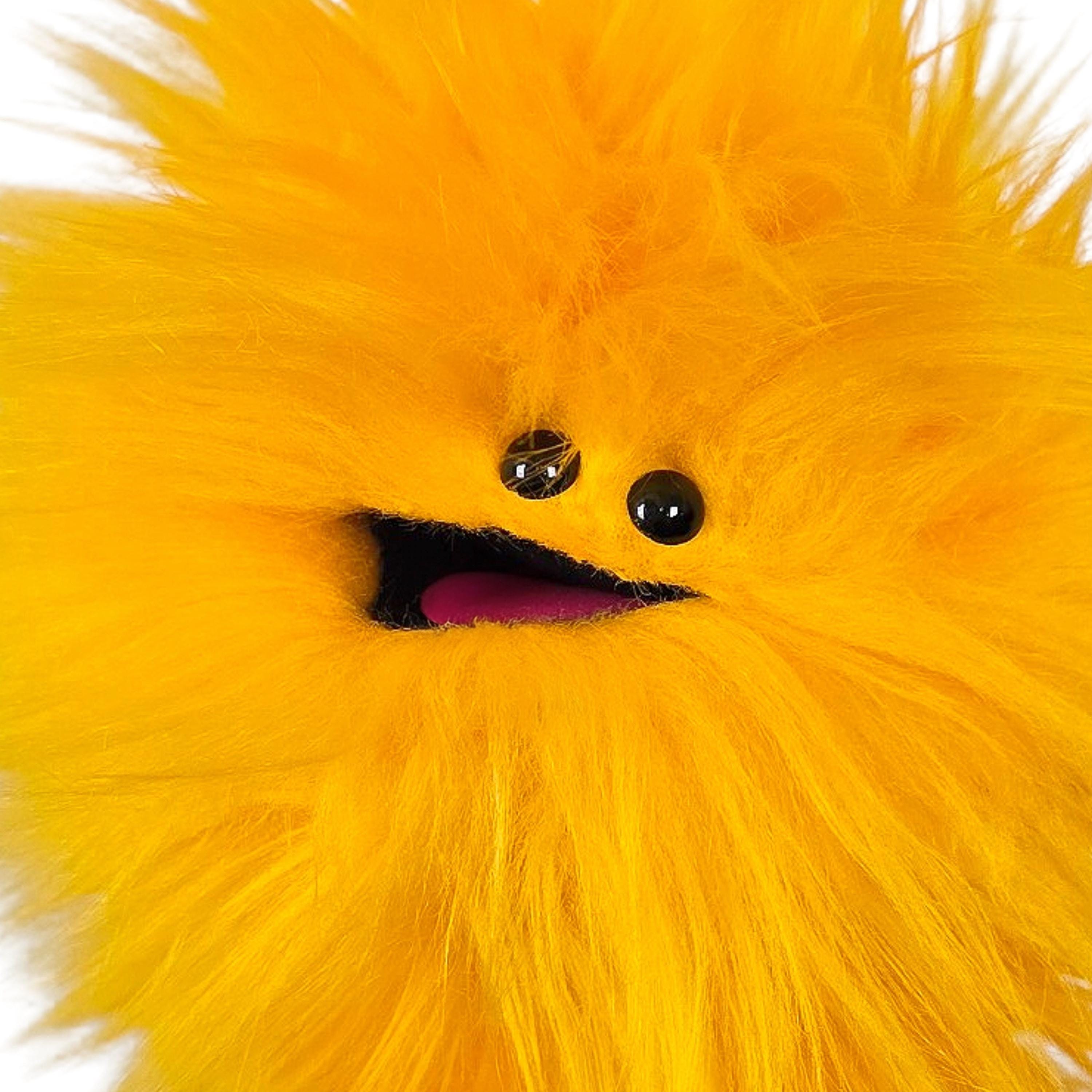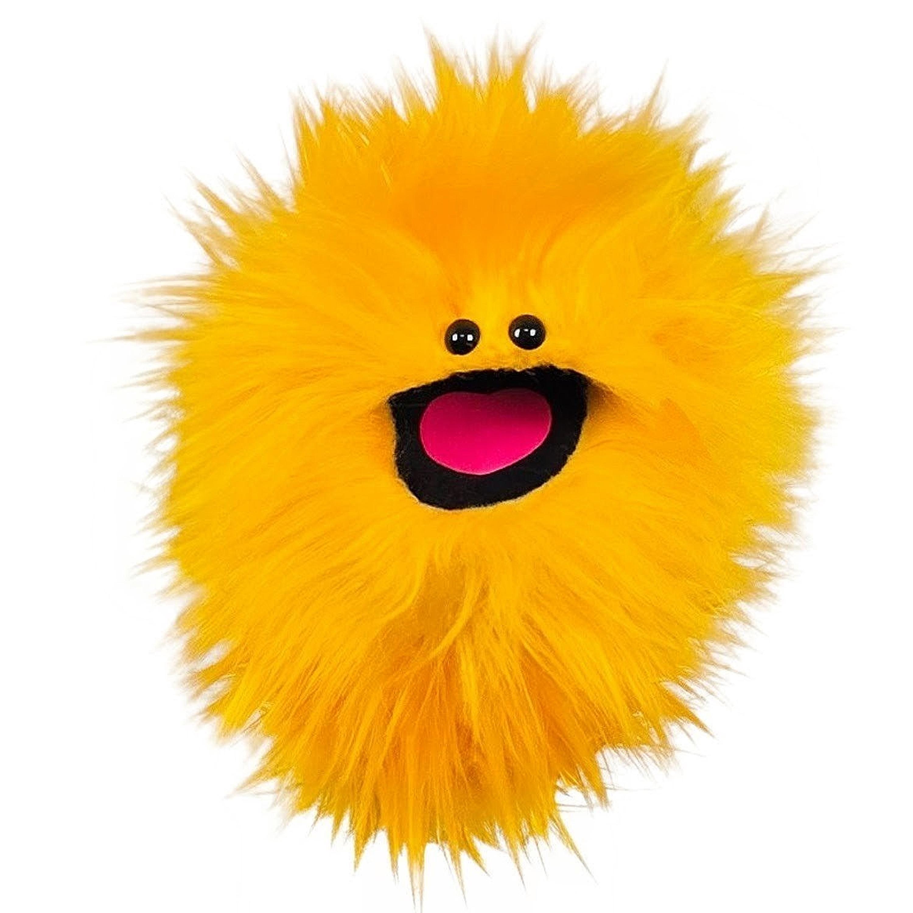 This is a practice puppet of a yellow monster with beady eyes. Perfect for puppetry practice!