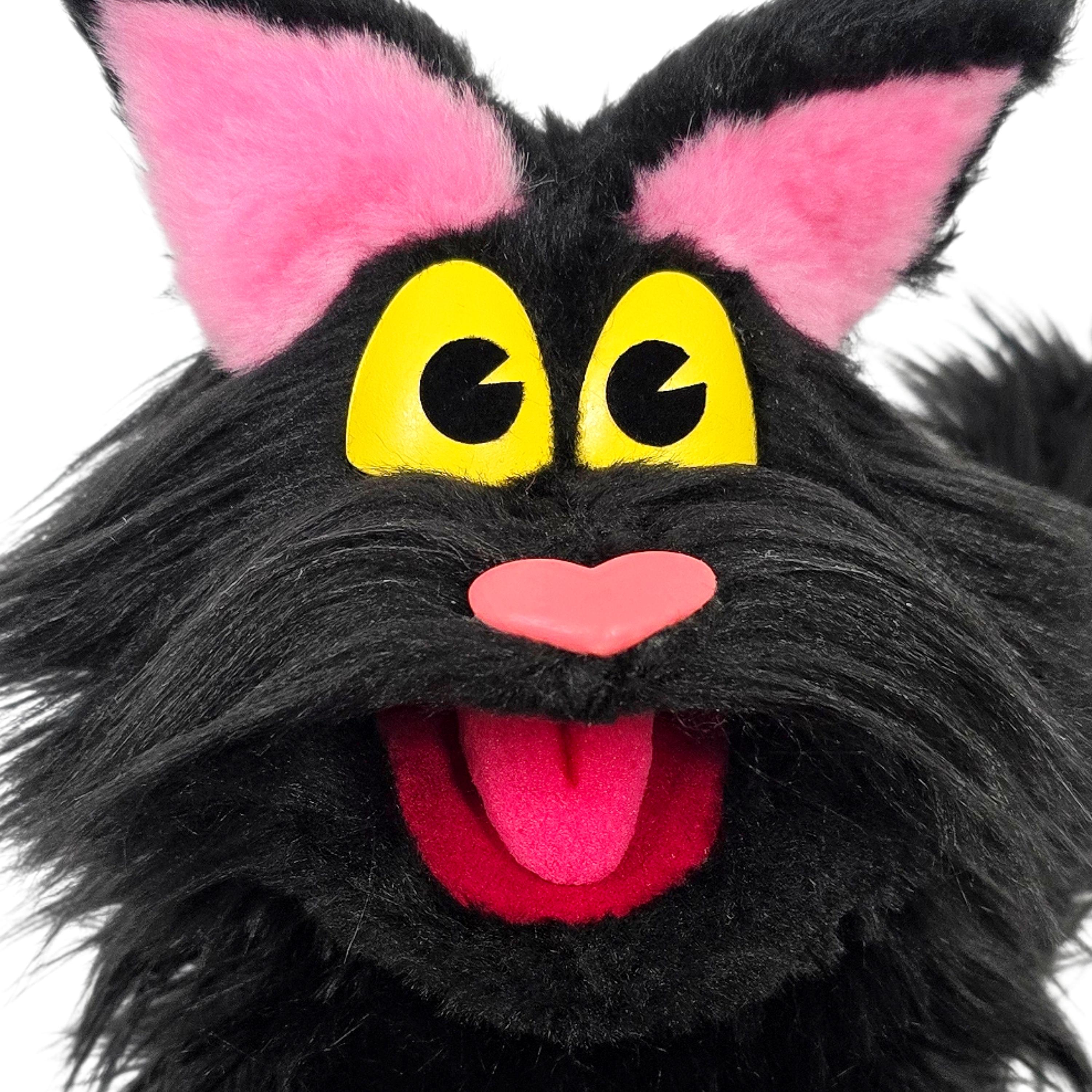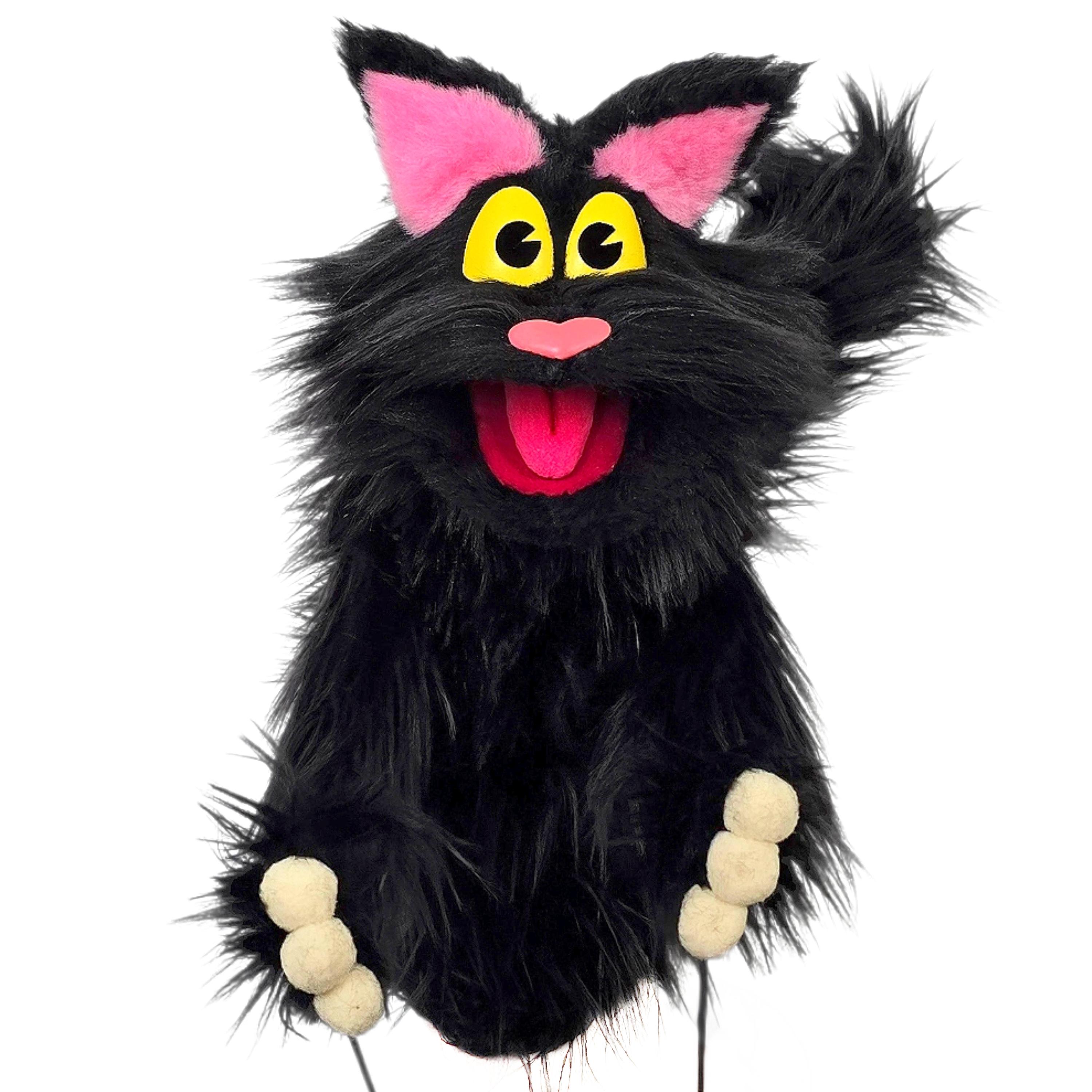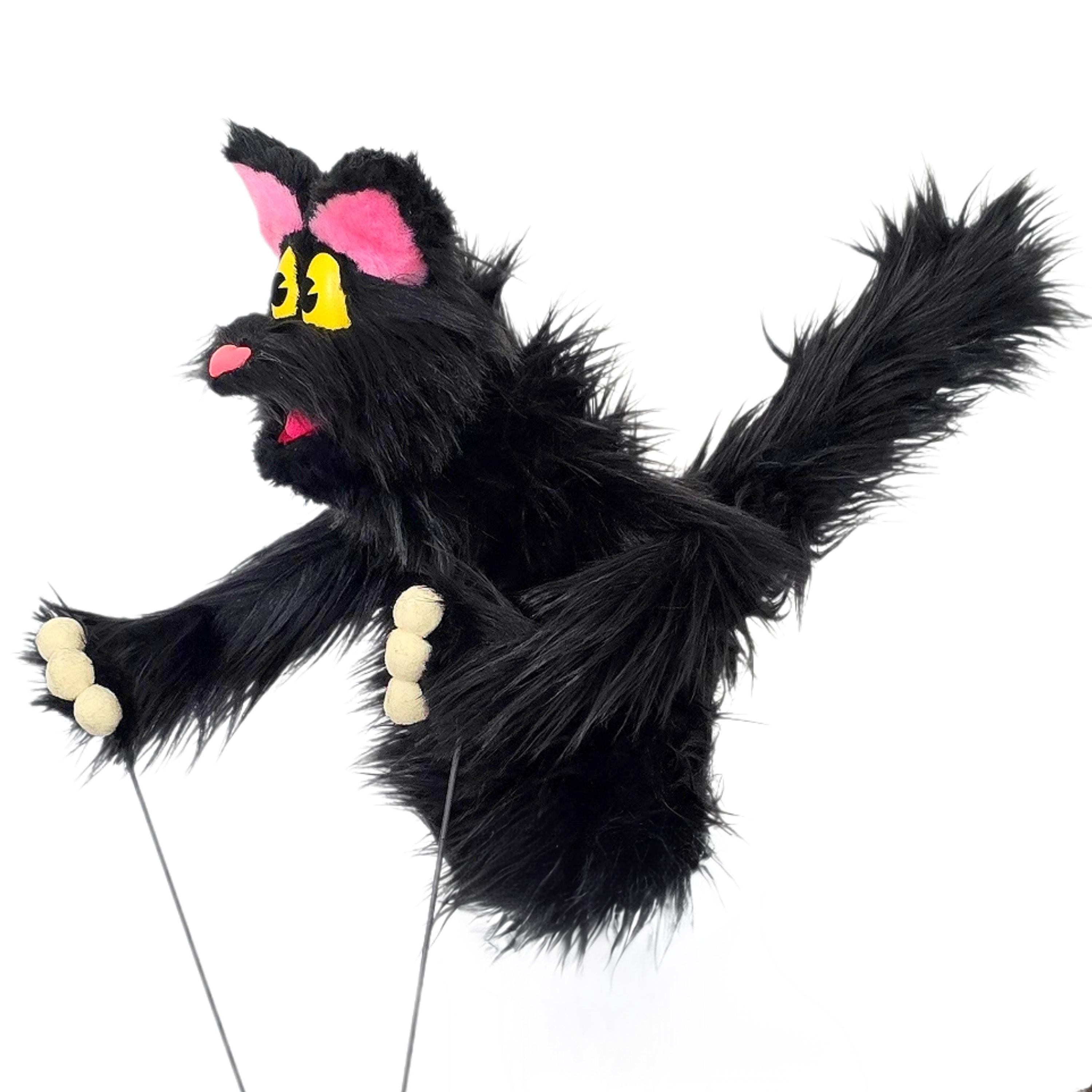This is a hand and rod puppet of a black cat character. It is of professional quality, using quality fabrics. Made of foam and super soft faux fur. With yellow eyes, permanent arm rods and poseable tail. See the attached photos for more!