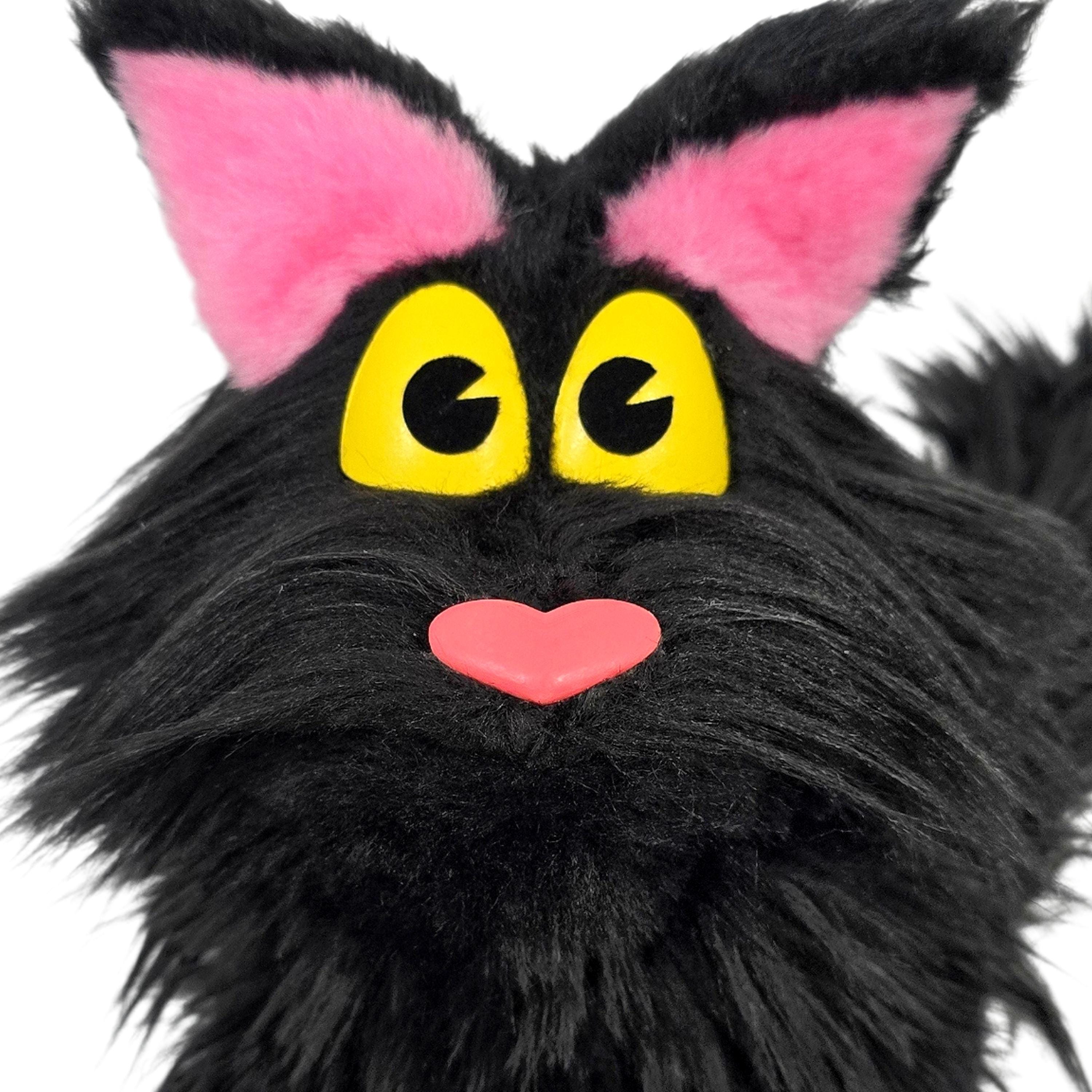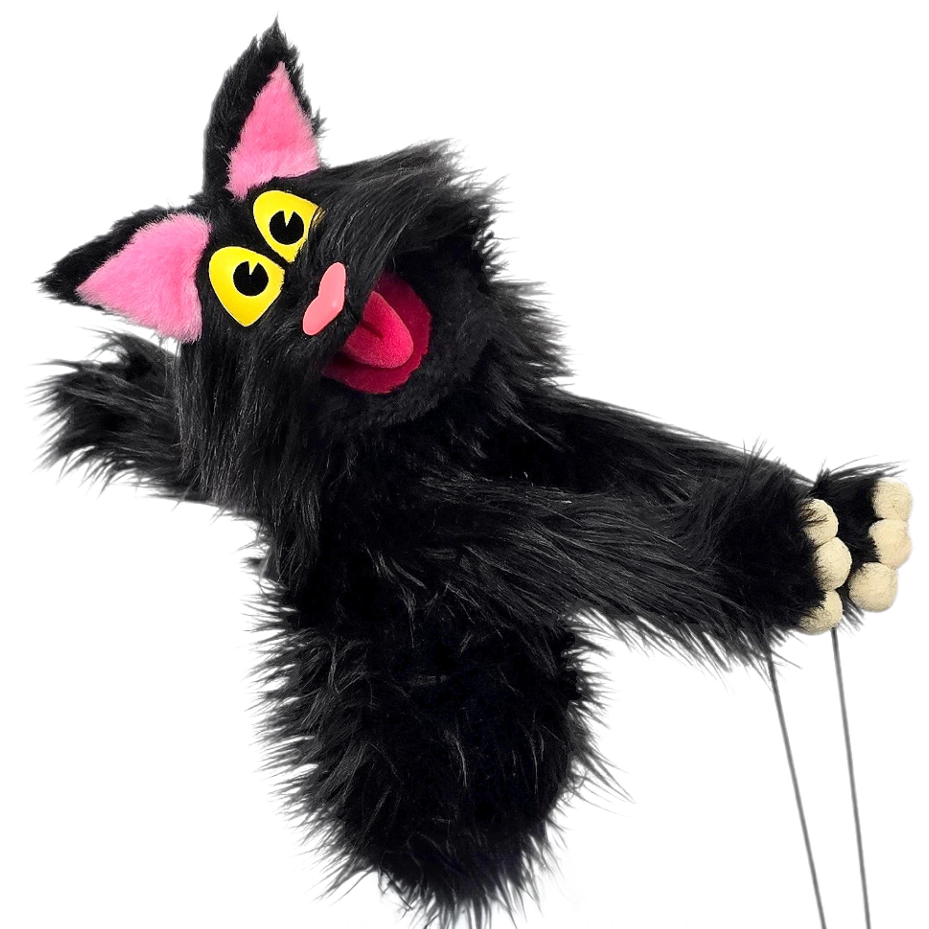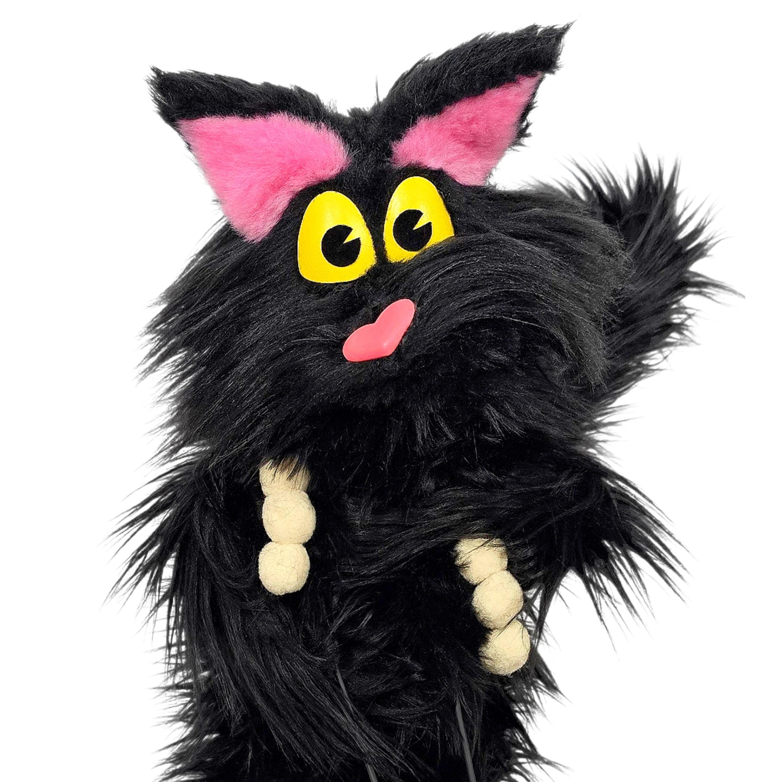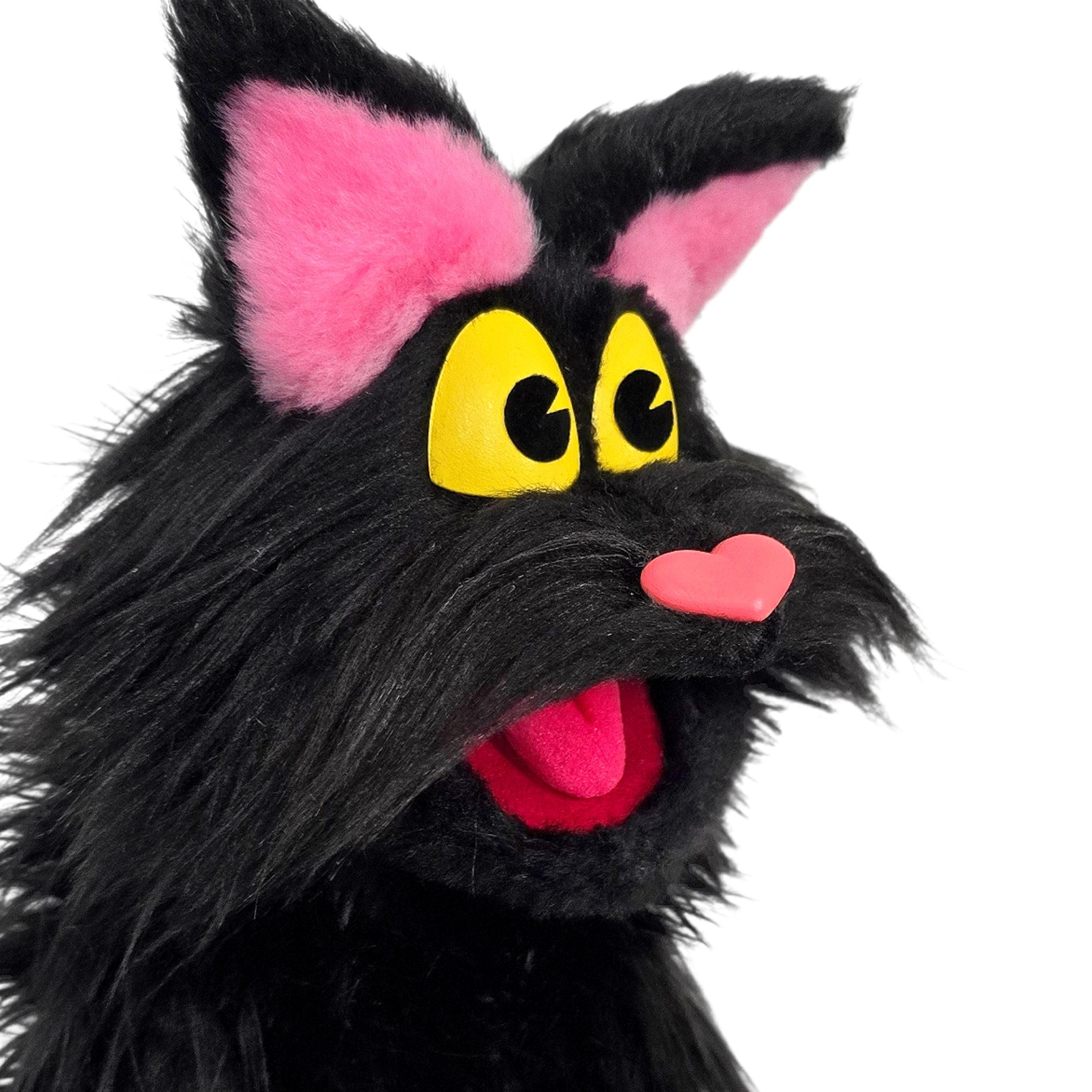 This is a hand and rod puppet of a black cat character. It is of professional quality, using quality fabrics. Made of foam and super soft faux fur. With yellow eyes, permanent arm rods and poseable tail. See the attached photos for more!