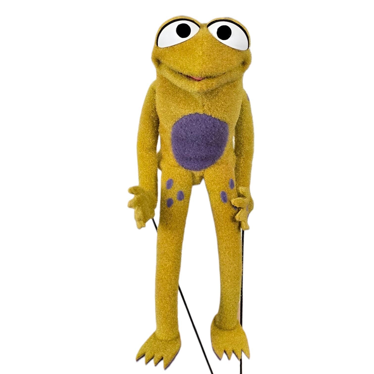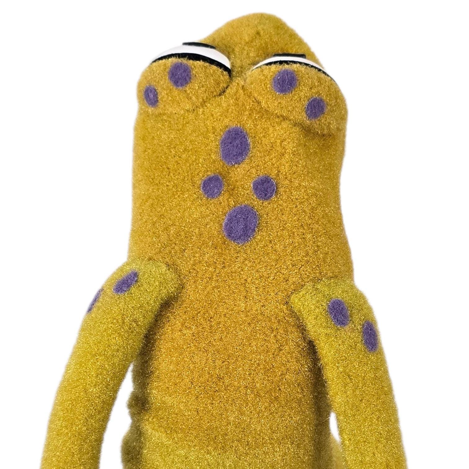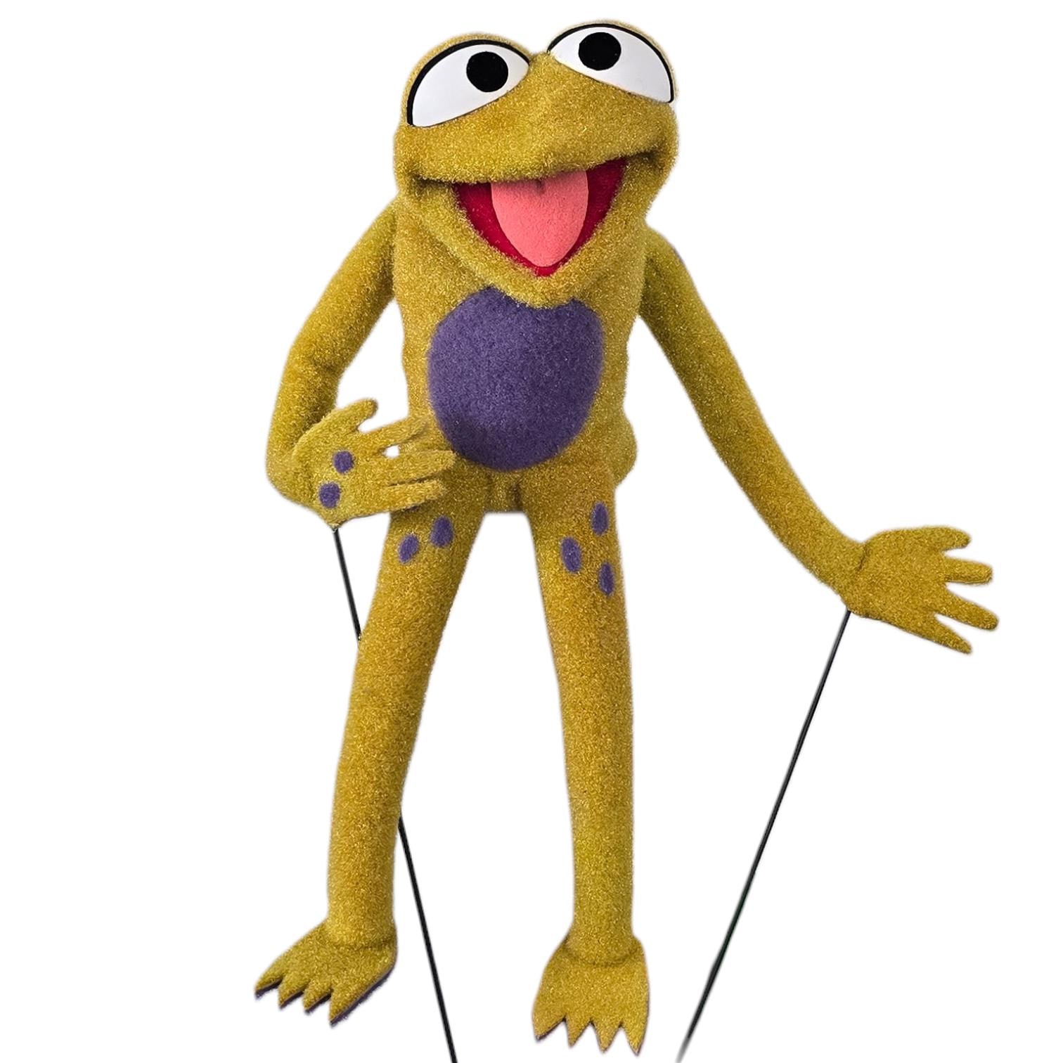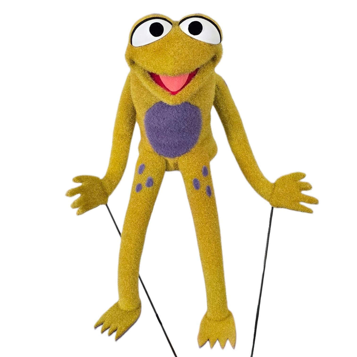 This is a hand and rod puppet of a small, splotchy golden frog character with purple details. It is of professional quality, using quality fabrics.
