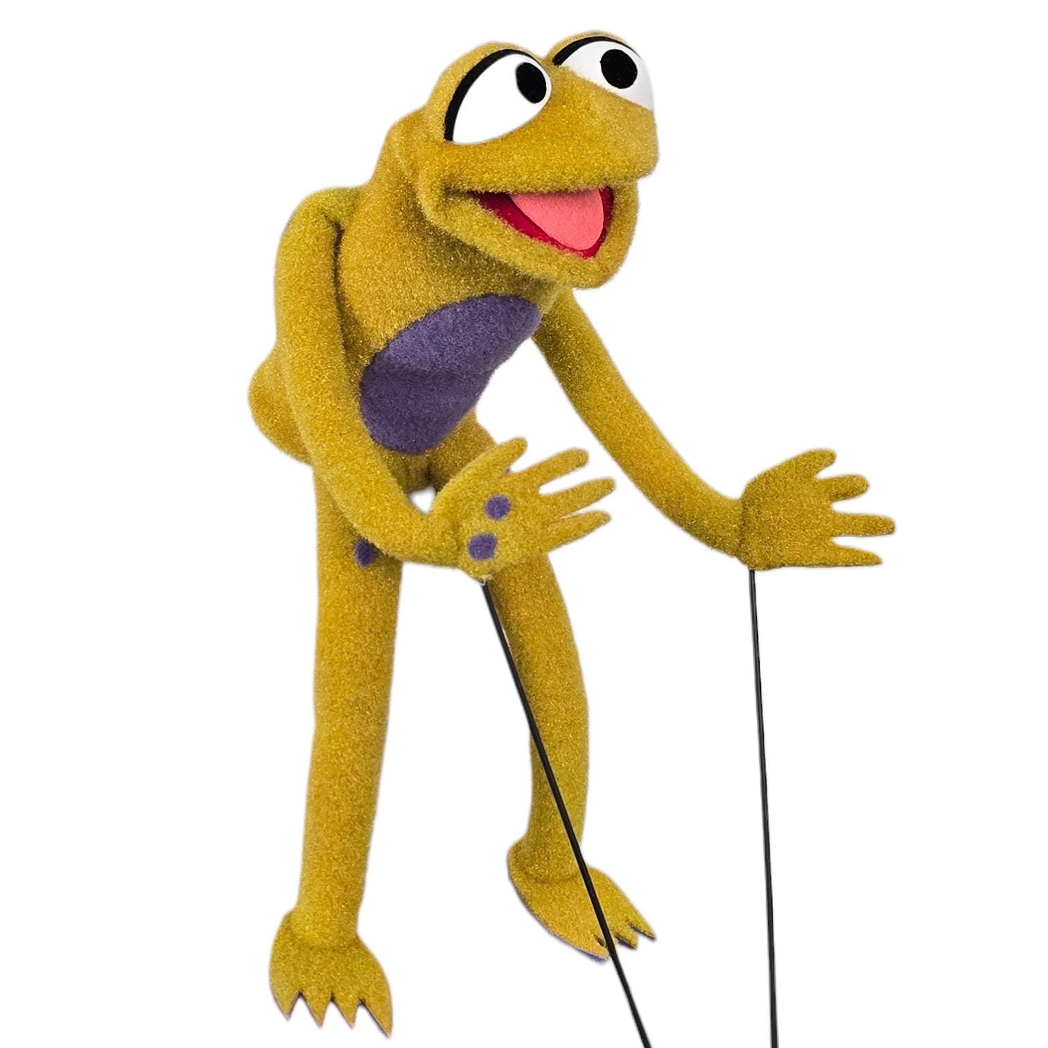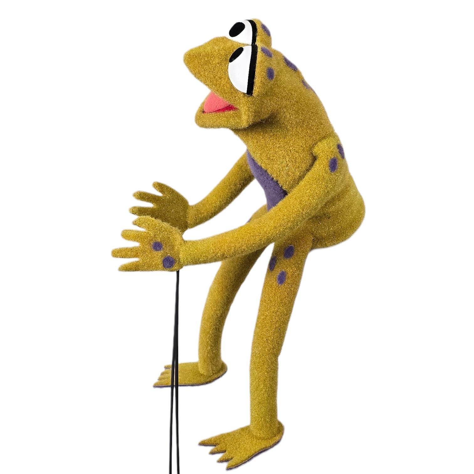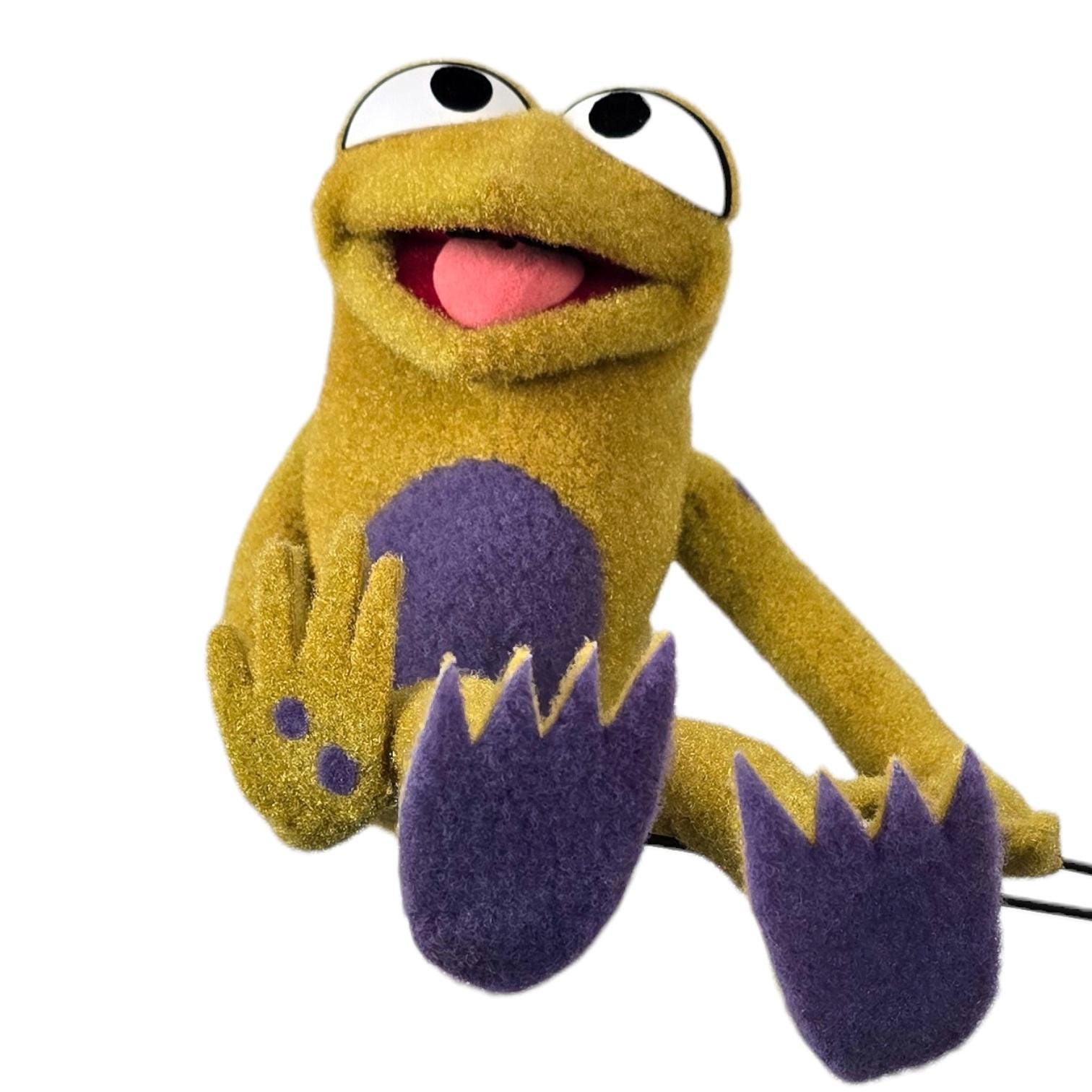 This is a hand and rod puppet of a small, splotchy golden frog character with purple details. It is of professional quality, using quality fabrics.