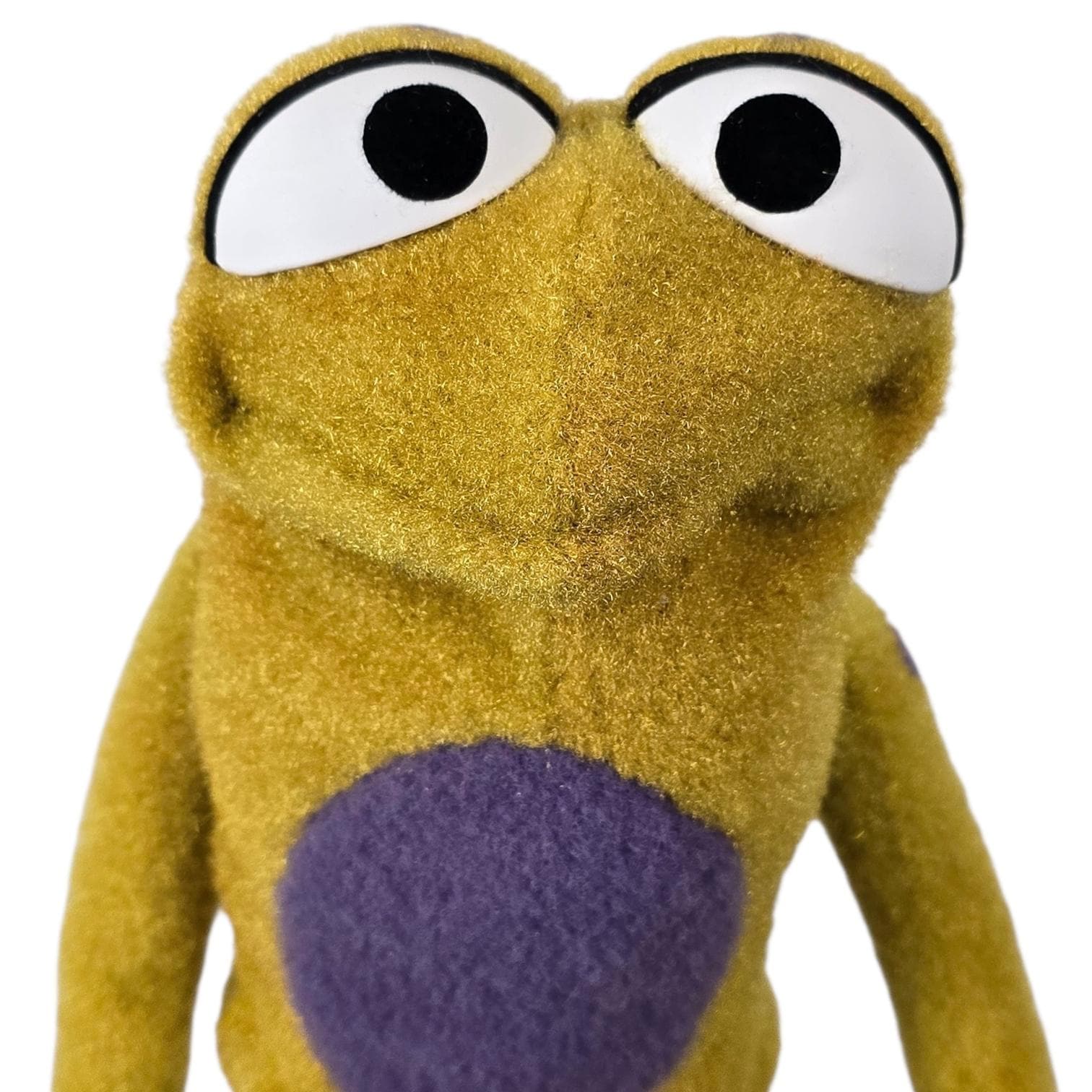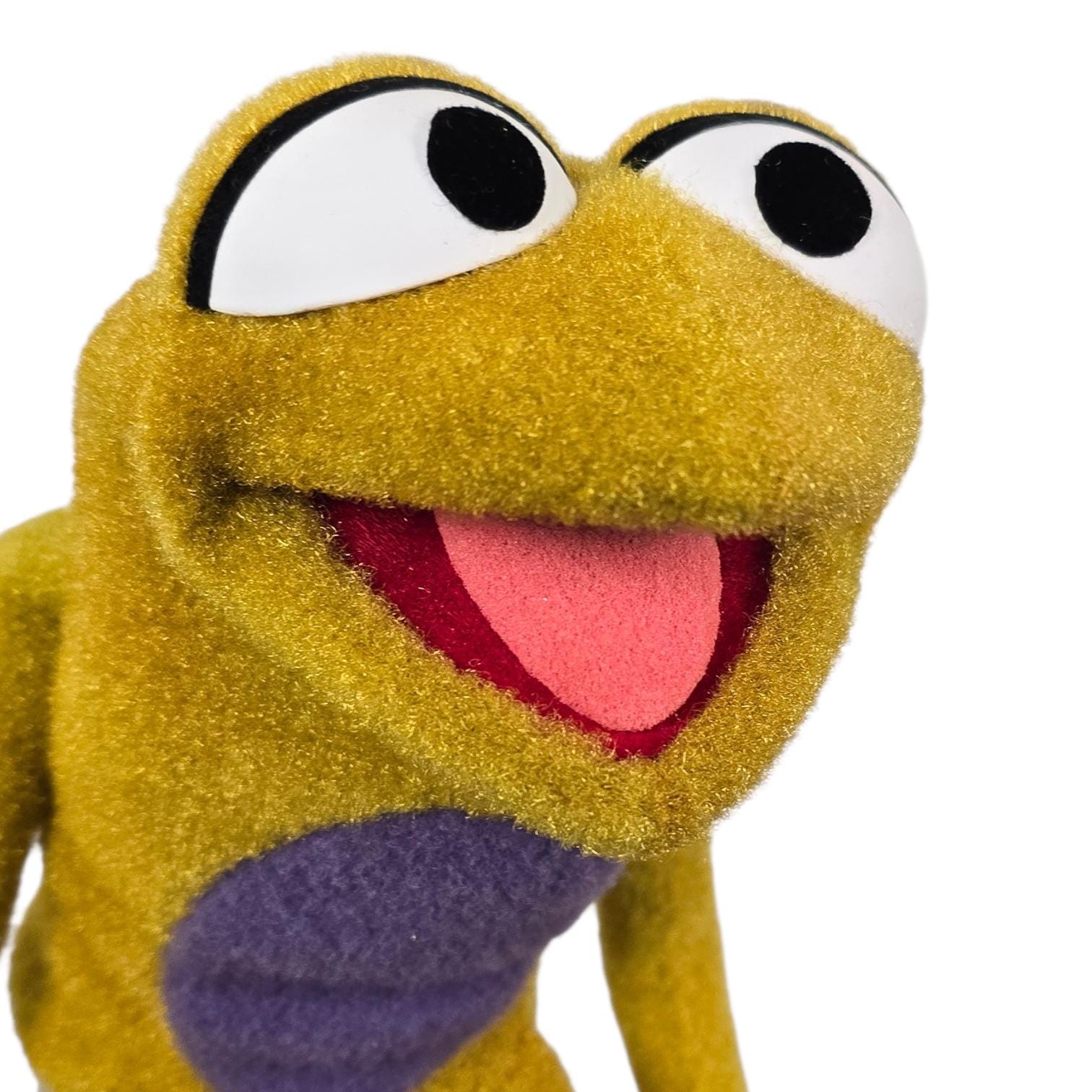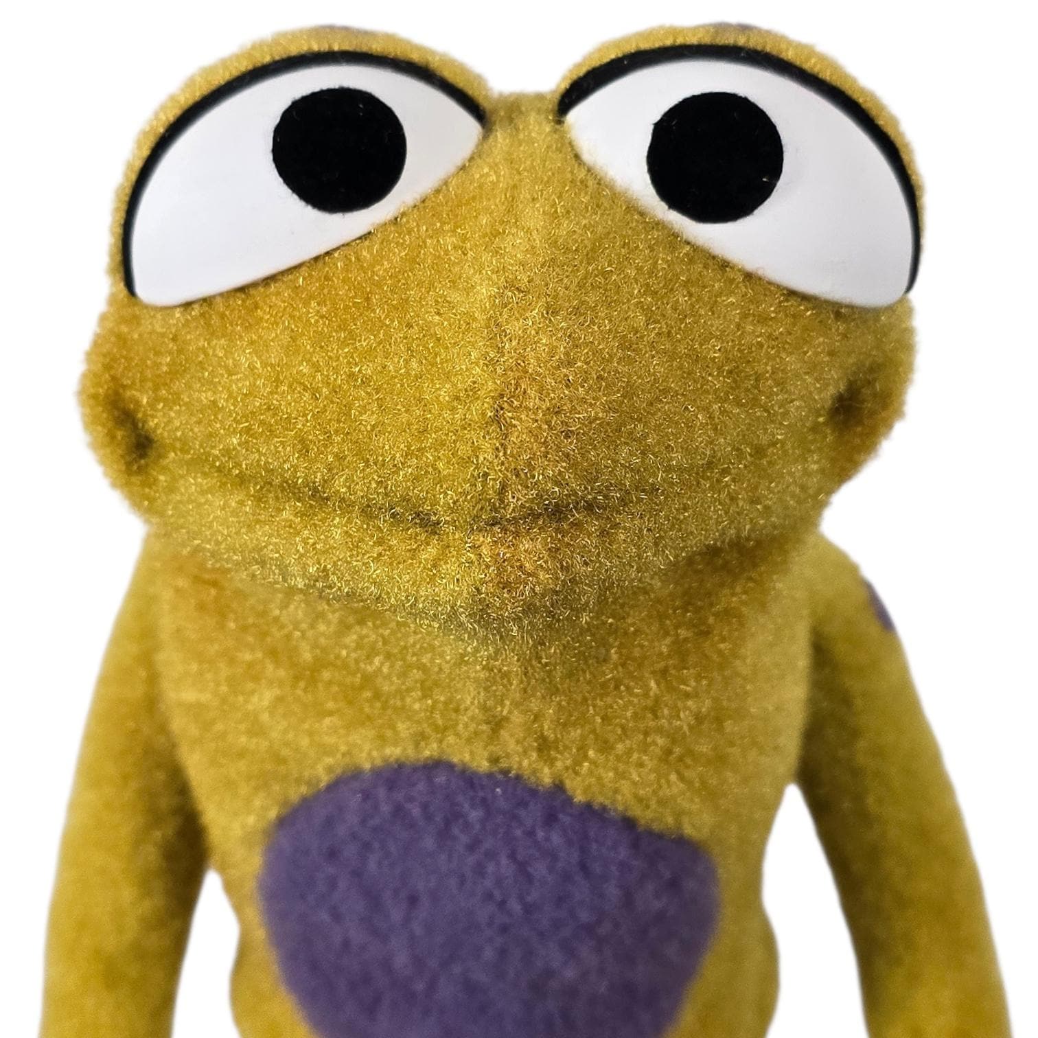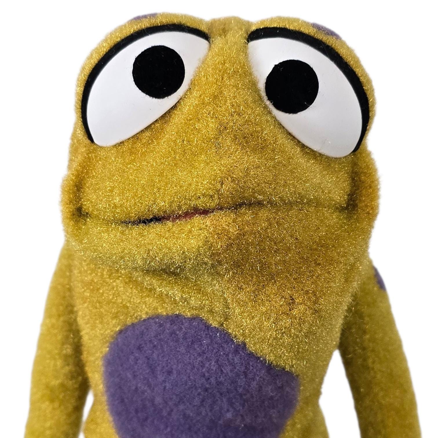 This is a hand and rod puppet of a small, splotchy golden frog character with purple details. It is of professional quality, using quality fabrics.