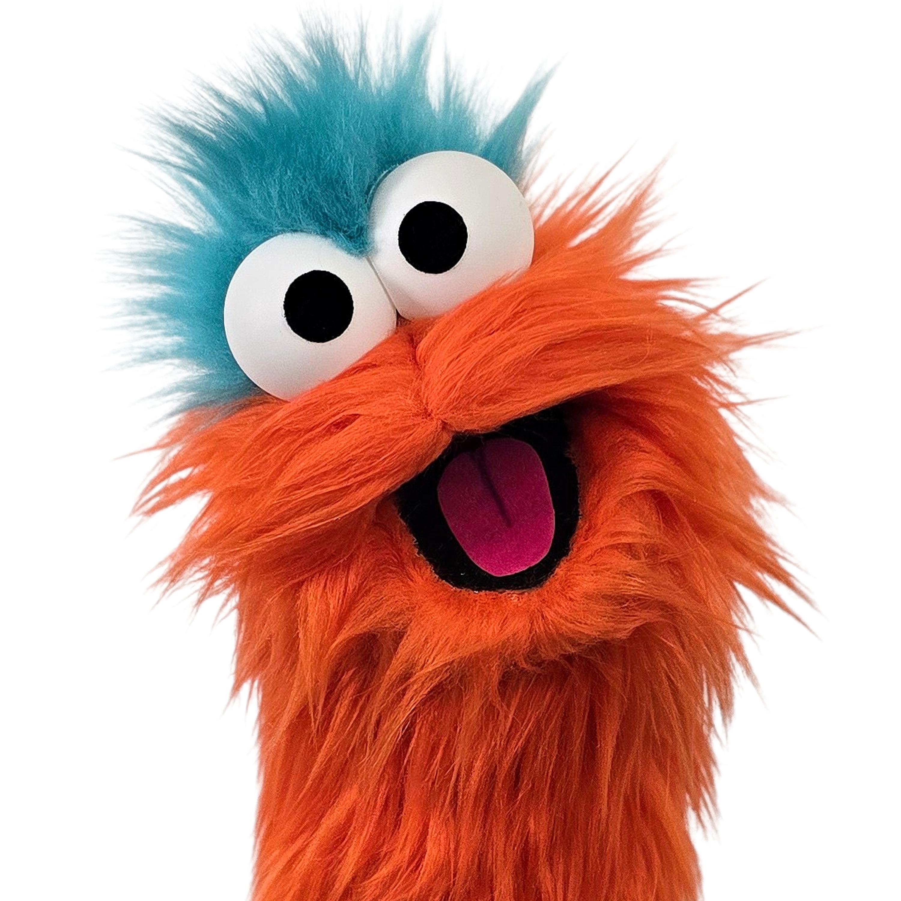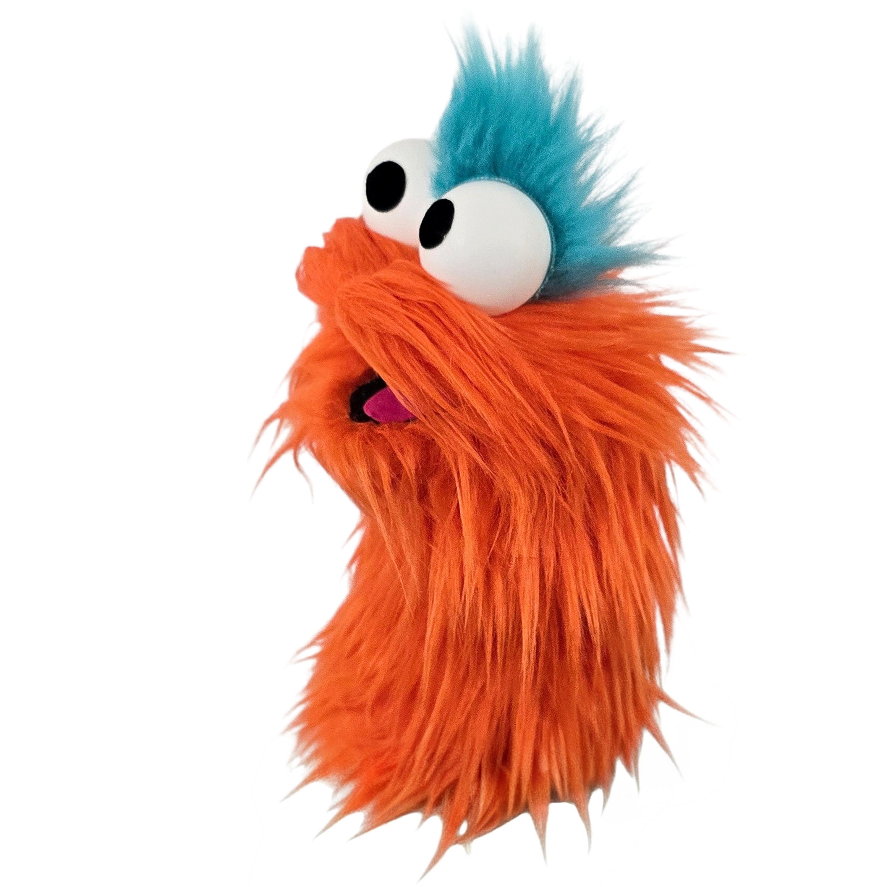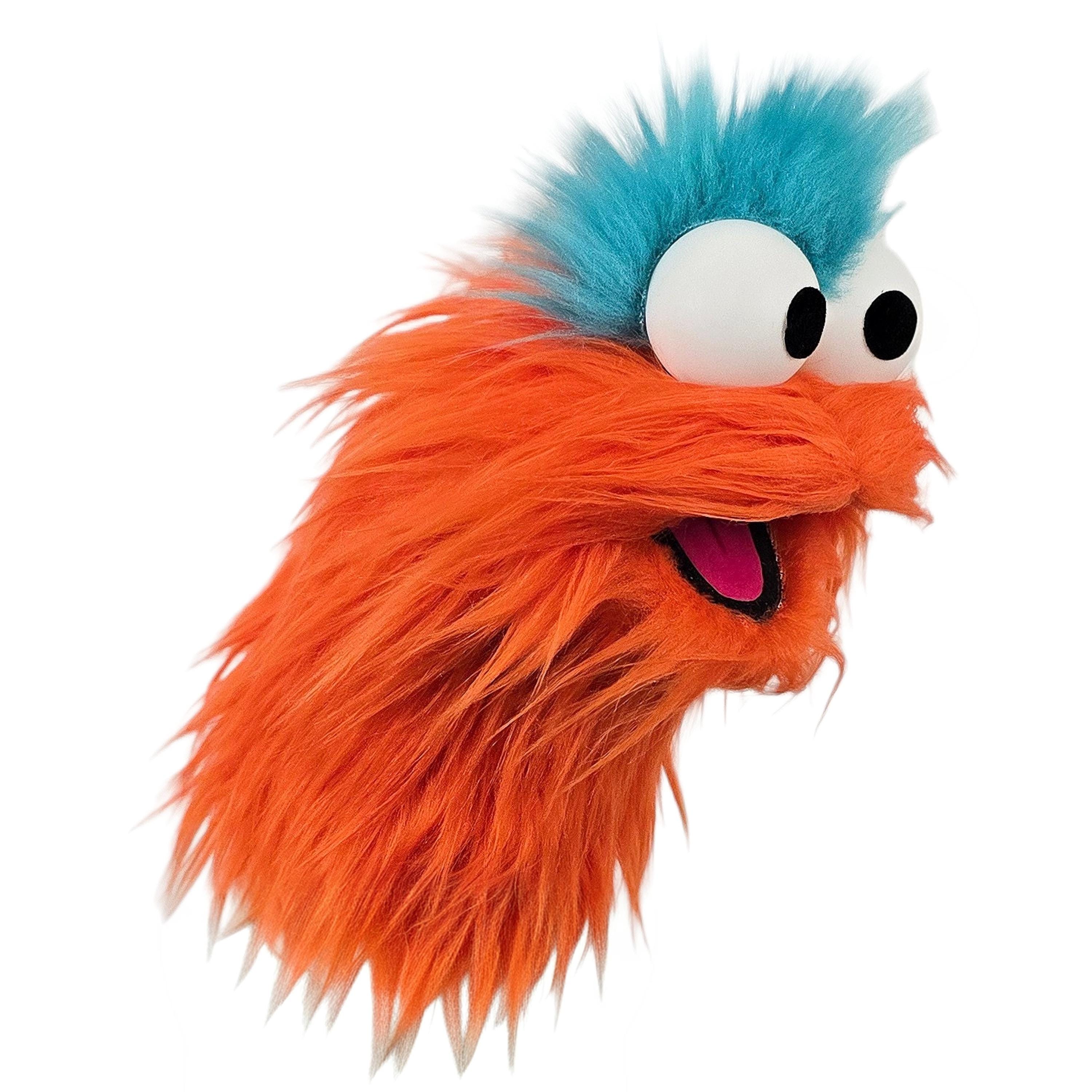 This is a practice puppet of an orange monster with blue hair. Perfect for puppetry practice! It is of professional quality, using quality fabrics. Made of faux fur. See the attached photos for more!