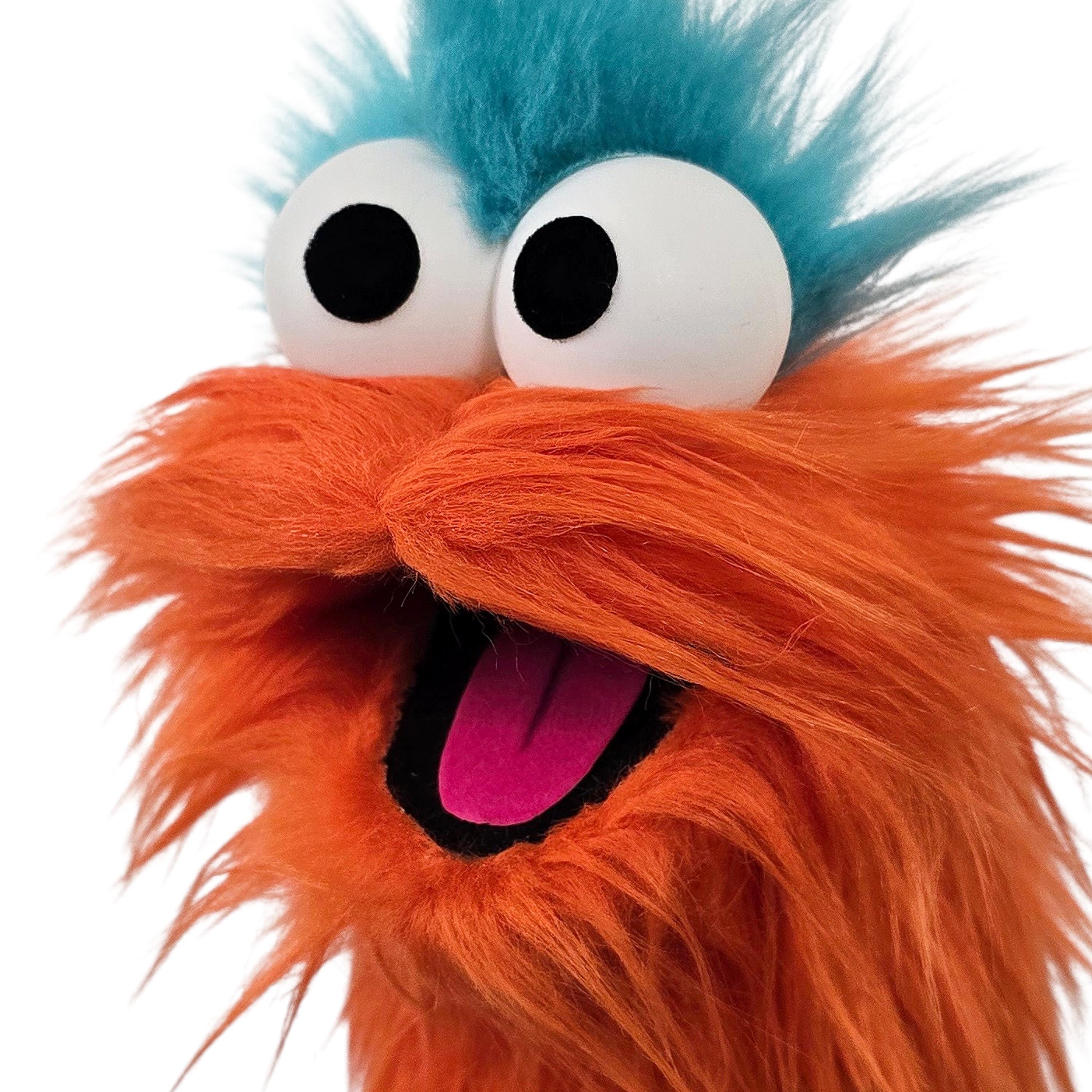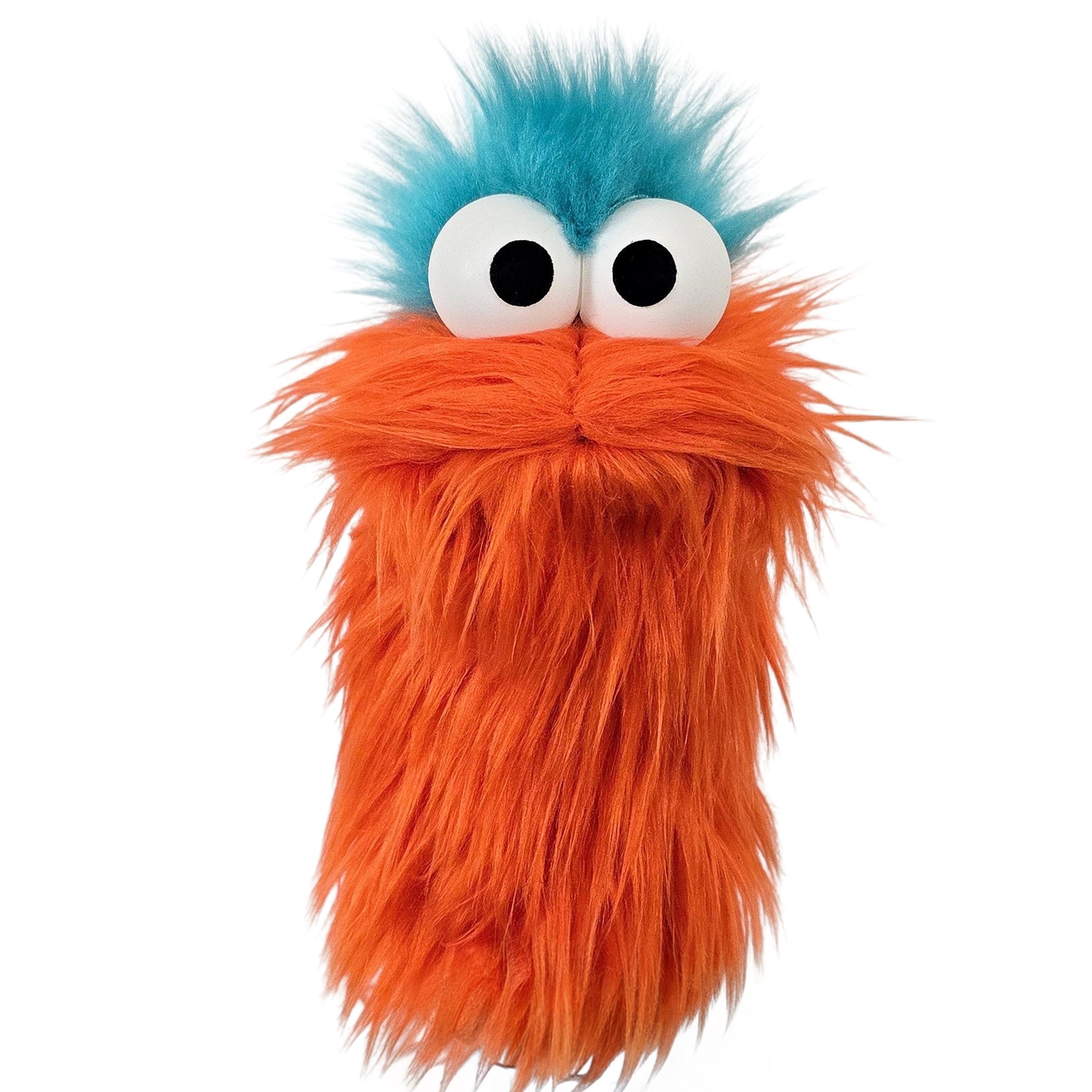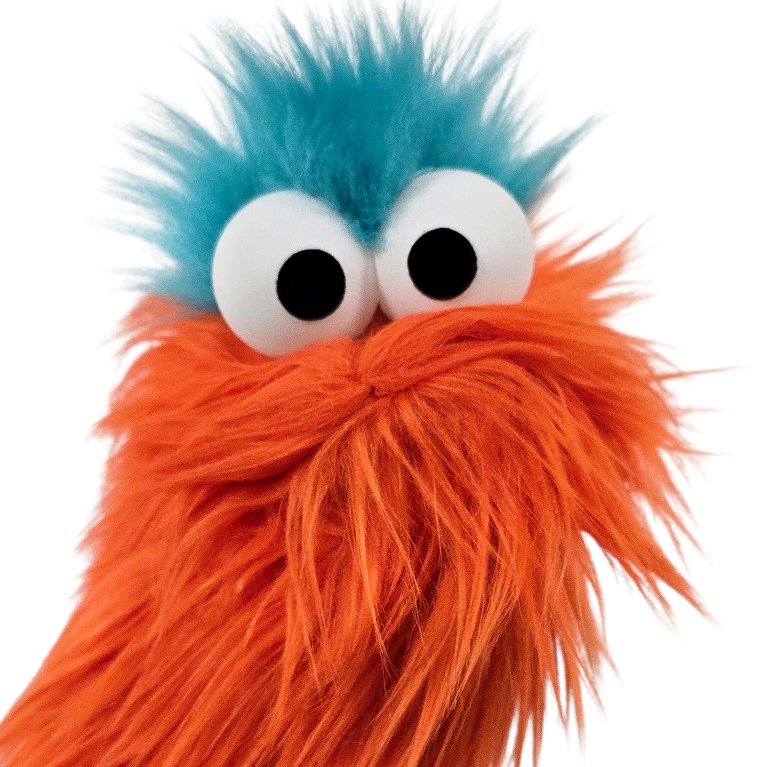 This is a practice puppet of an orange monster with blue hair. Perfect for puppetry practice! It is of professional quality, using quality fabrics. Made of faux fur. See the attached photos for more!